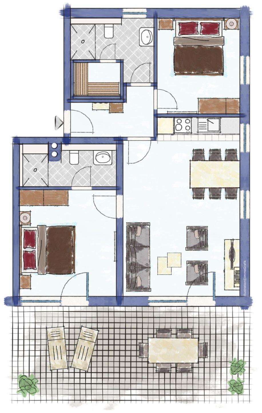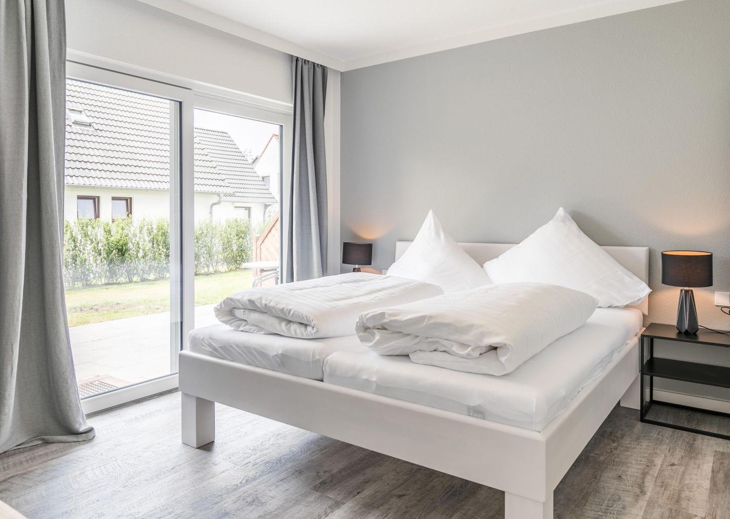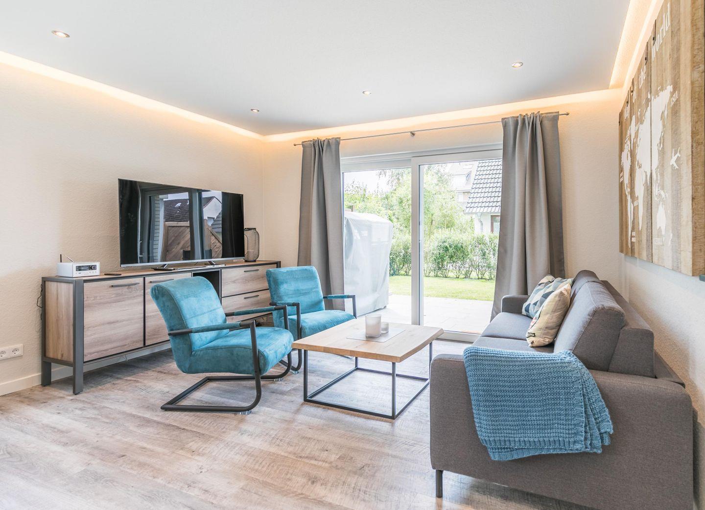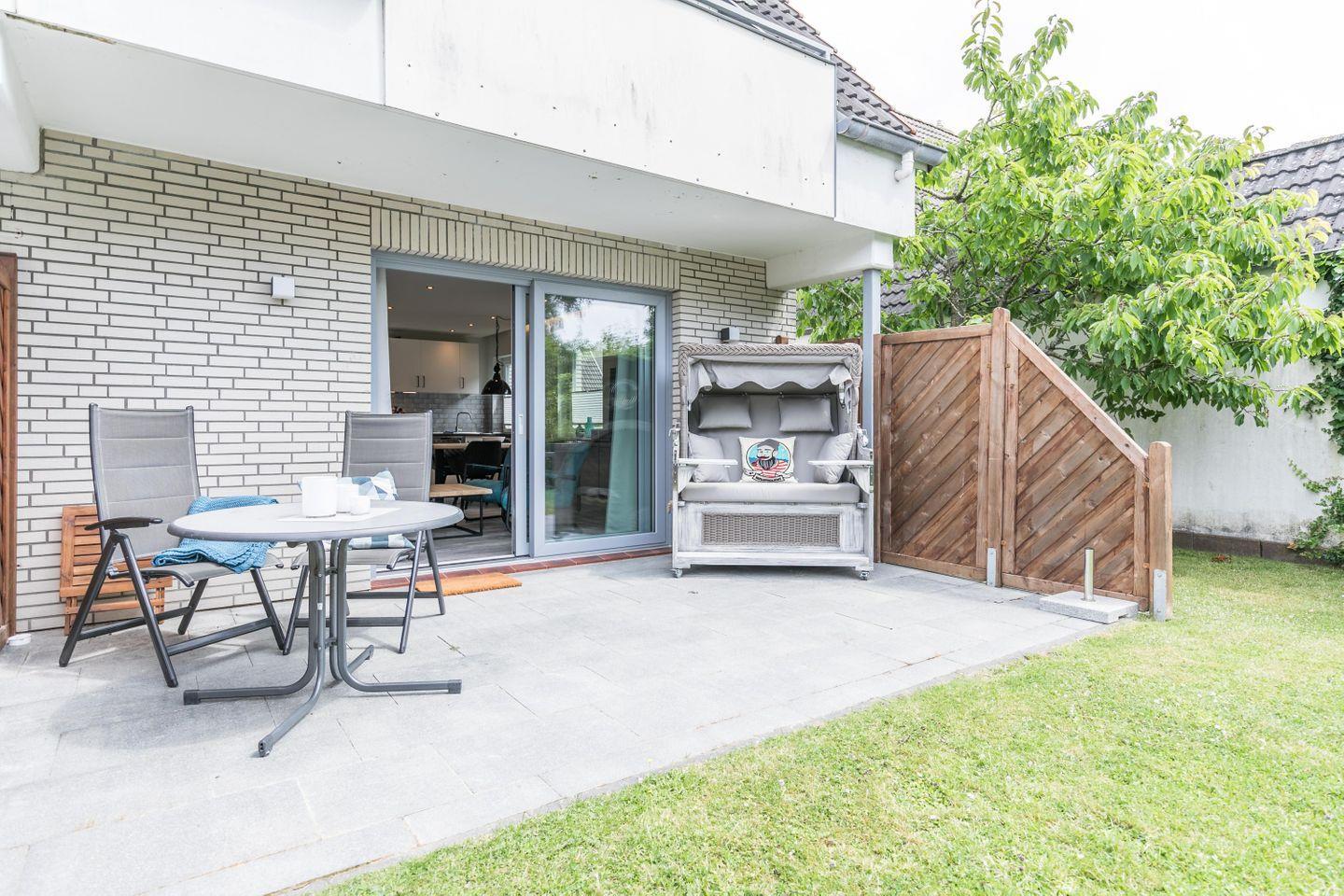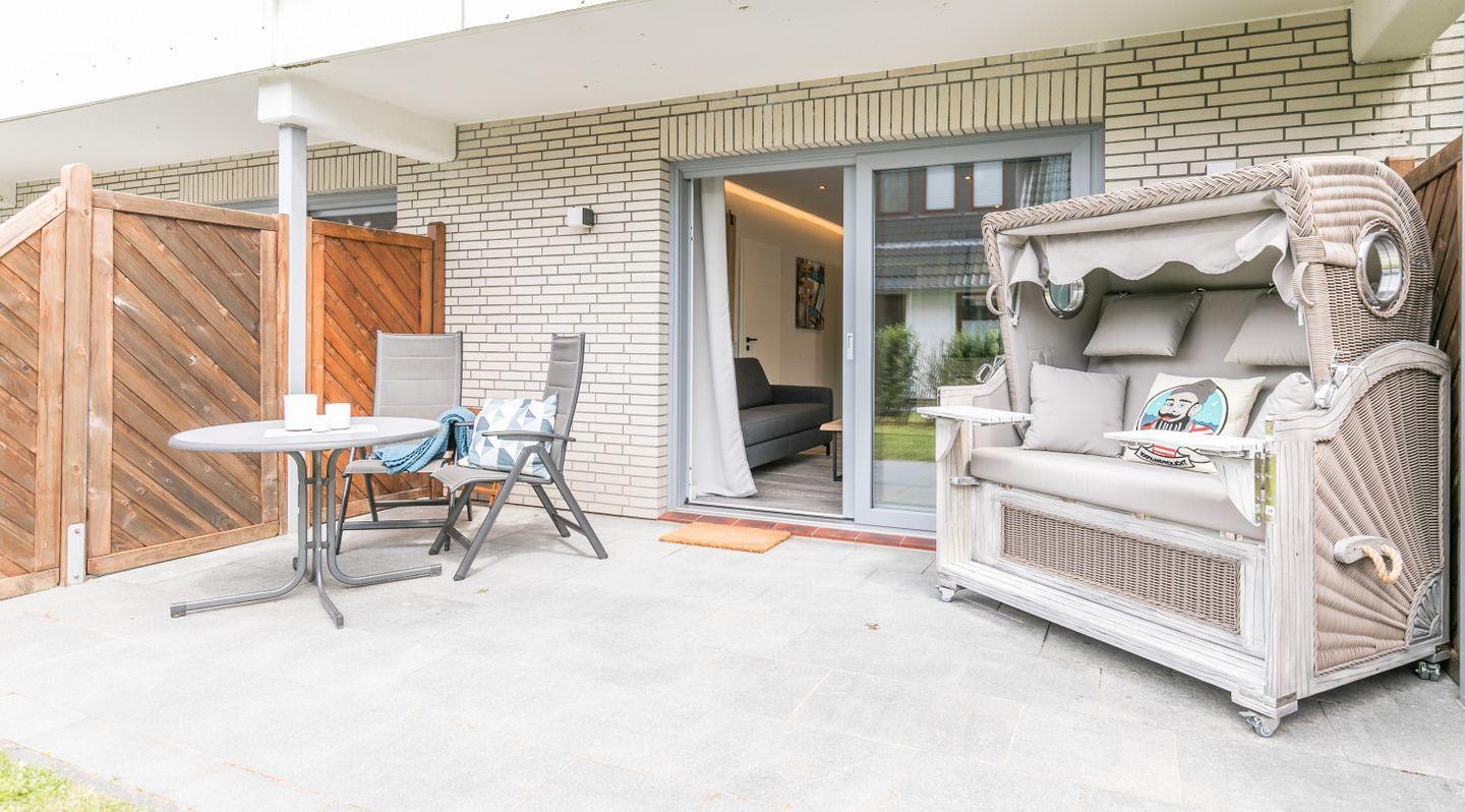 Die Wohnung 2 befindet sich im Erdgeschoss und hat einen eigene Terrasse samt Gartenmöbeln sowie hochwertigem, großen Strandkorb.