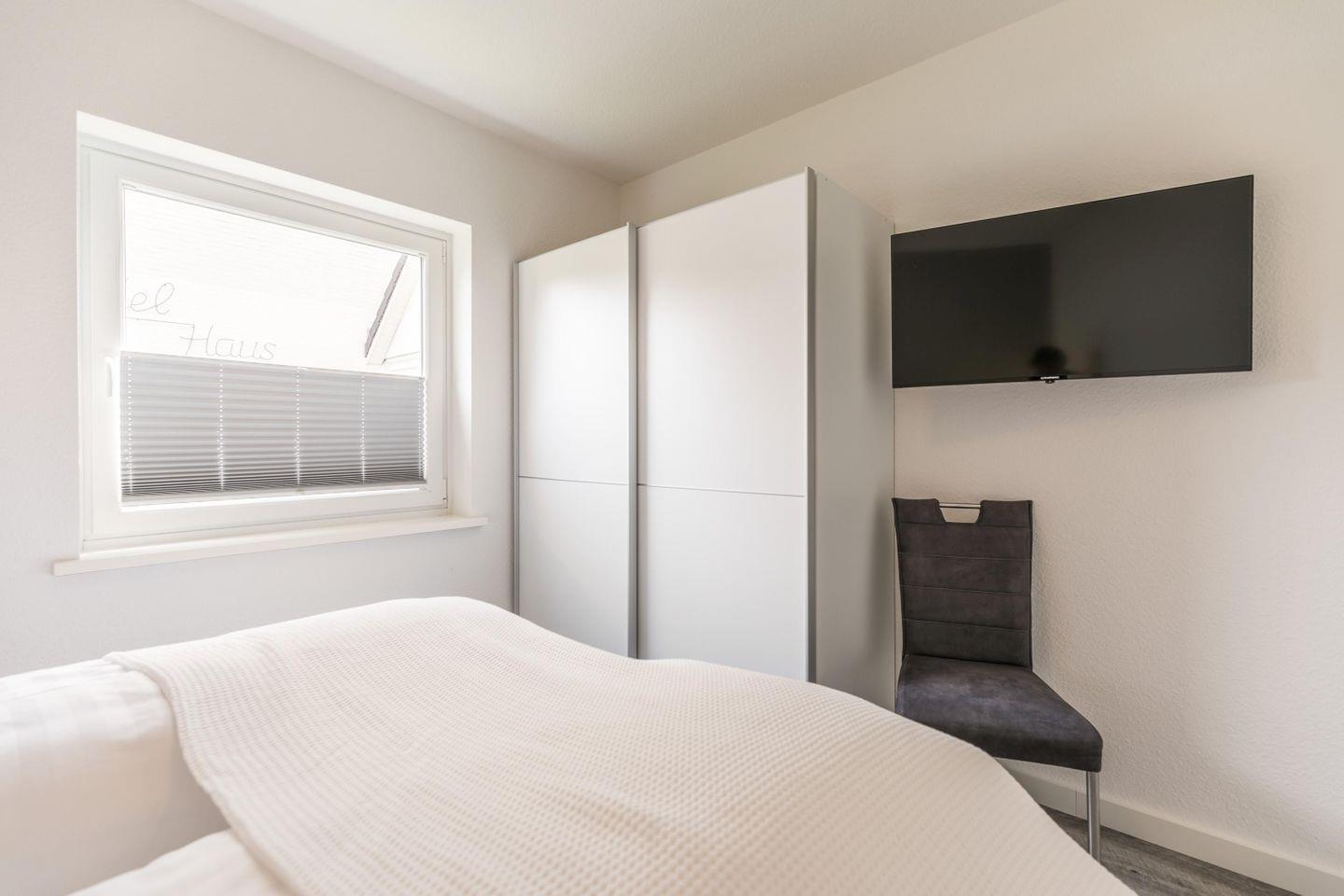 Doppelbett (1,80x2,00m) mit Nachttischen und Lampen, Lattenrost Kopf- und Fußteil höhenverstellbar, Kleiderschrank, Flachbild-TV, Verdunkelungsgardinen, Schranktresor, Zugang zur Terrasse