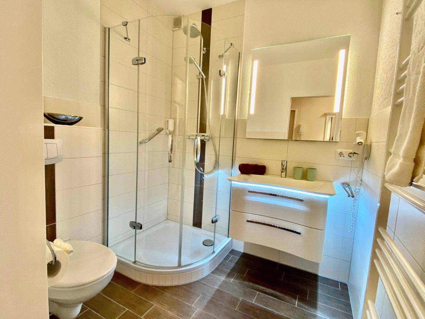 Das Bad ist modern und mit einer Dusche ausgestattet.