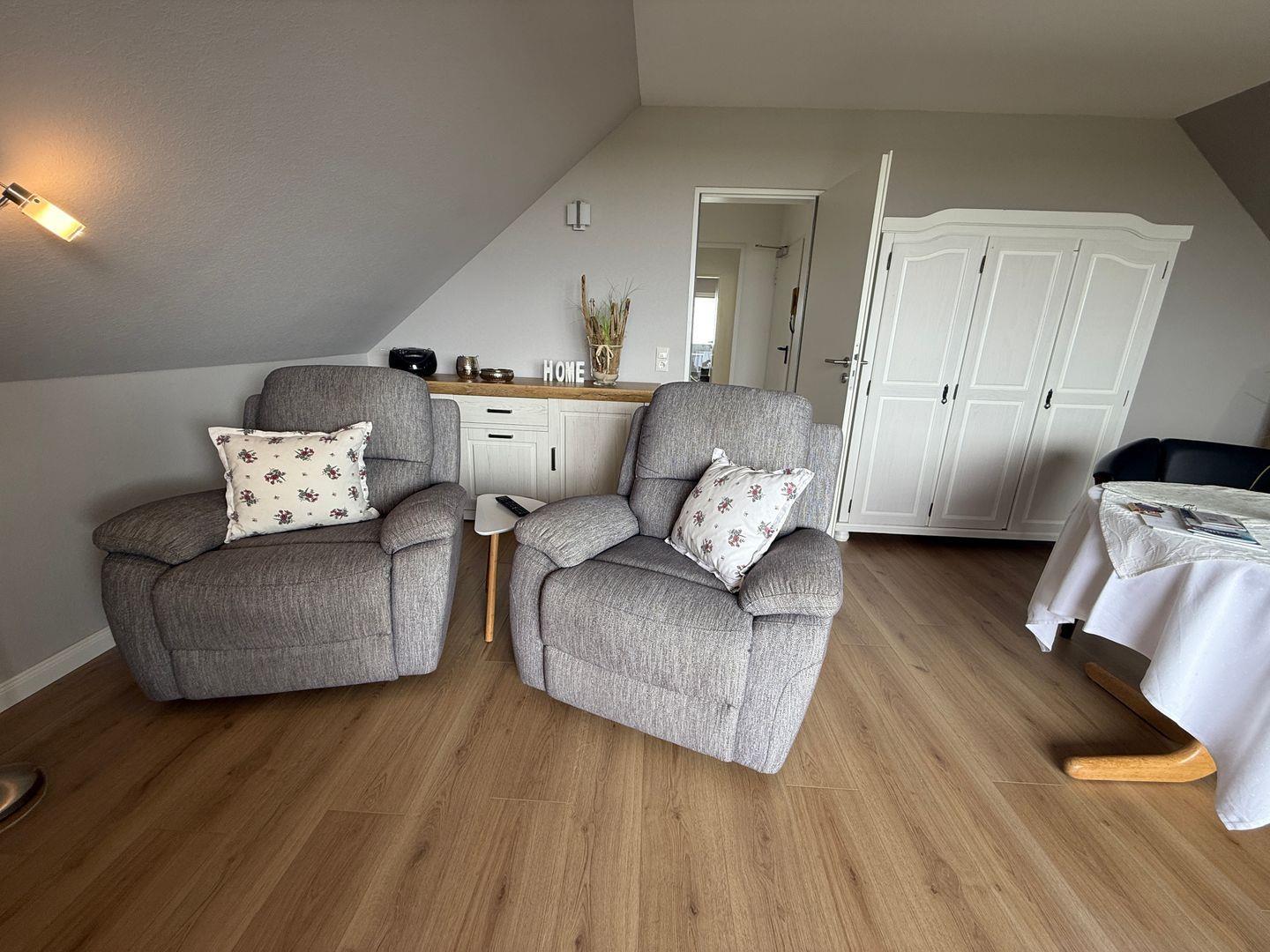 Ein komfortables Doppelbett sorgt für erholsame Nächte, während zwei Fernsehsessel und eine kleine Sitzecke den Wohnbereich abrunden.