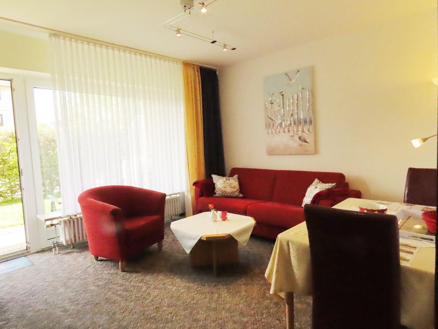 2-Raum-Wohnung für bis zu 4 Pers. (max. 2 Erwachsene und 2 Kinder), 1 Schlafzimmer + Schlafsofa im Wohnzimmer, Parterre mit Terasse, Wlan, 1 Duschbad, Haustiere auf Anfrage