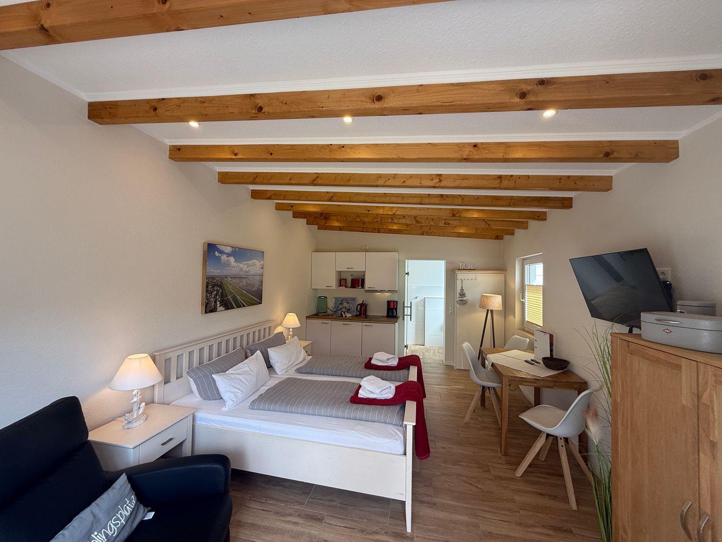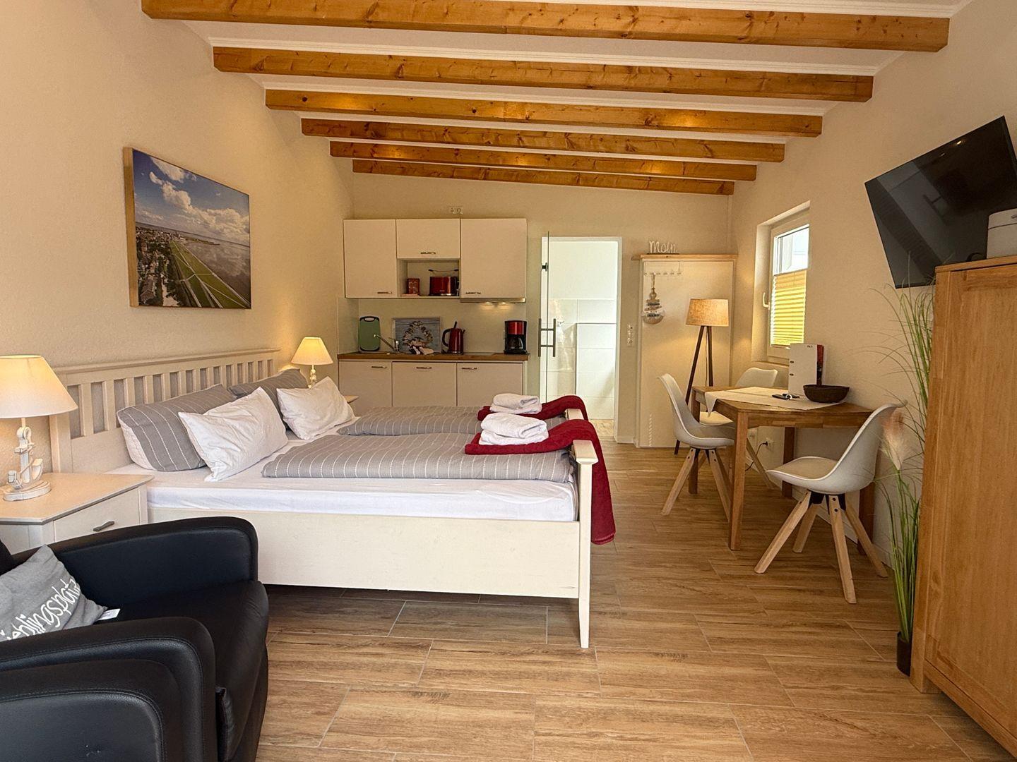 Herzlich willkommen in unserer gemütlichen Ein-Raum-Wohnung im Herzen von Büsum. In bequemen, höheren Boxspringbetten können Sie sich von den Erlebnissen des Tages erholen.