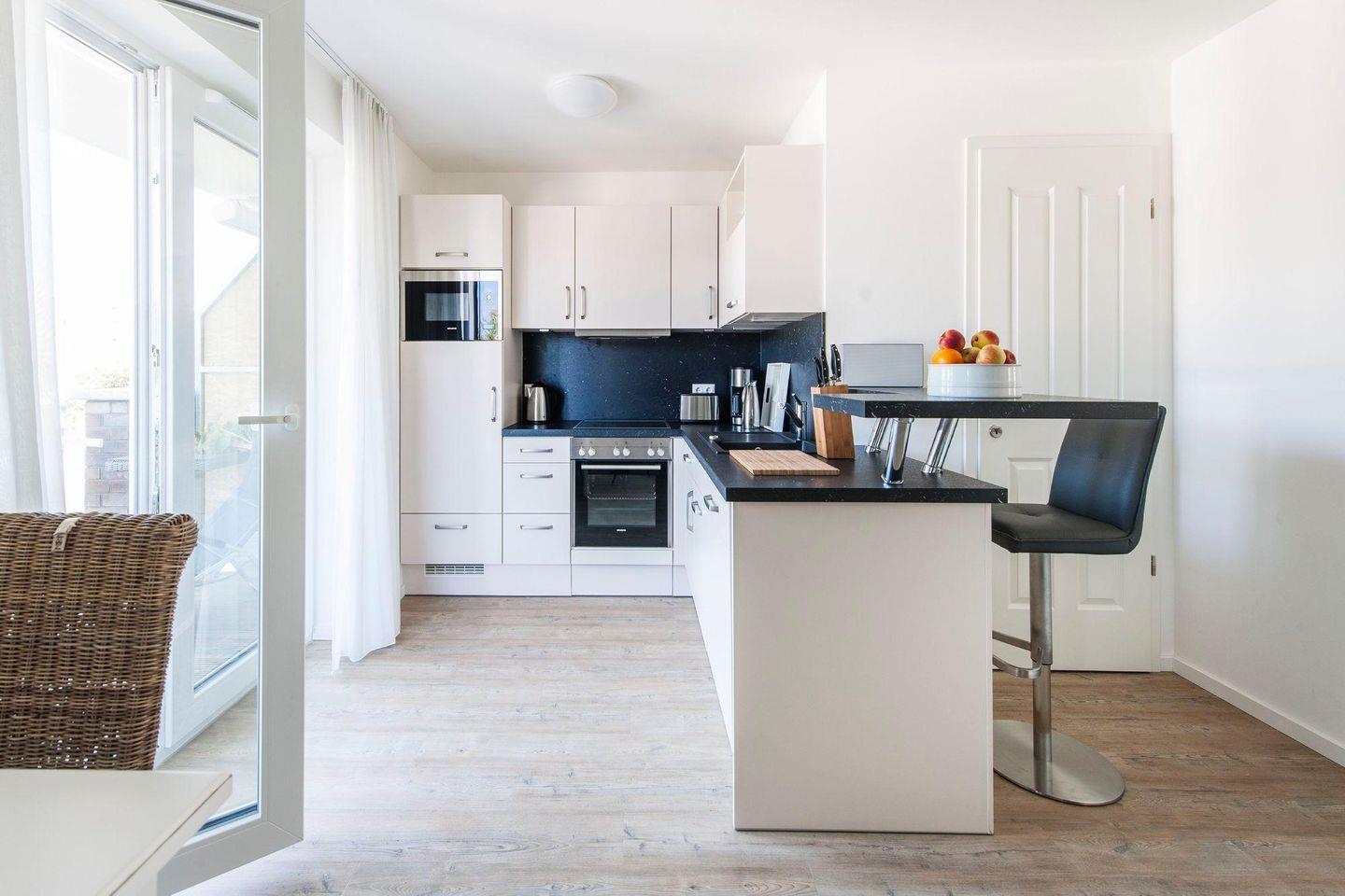 Küchenzeile: Geschirrspüler, Cerankochfeld, Mikrowelle, Backofen, Kühlschrank mit Gefrierfach.