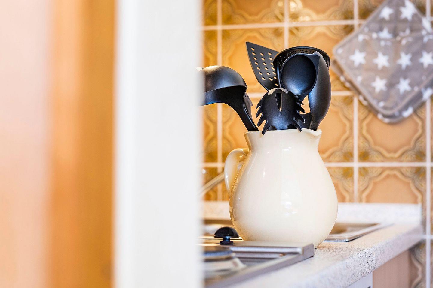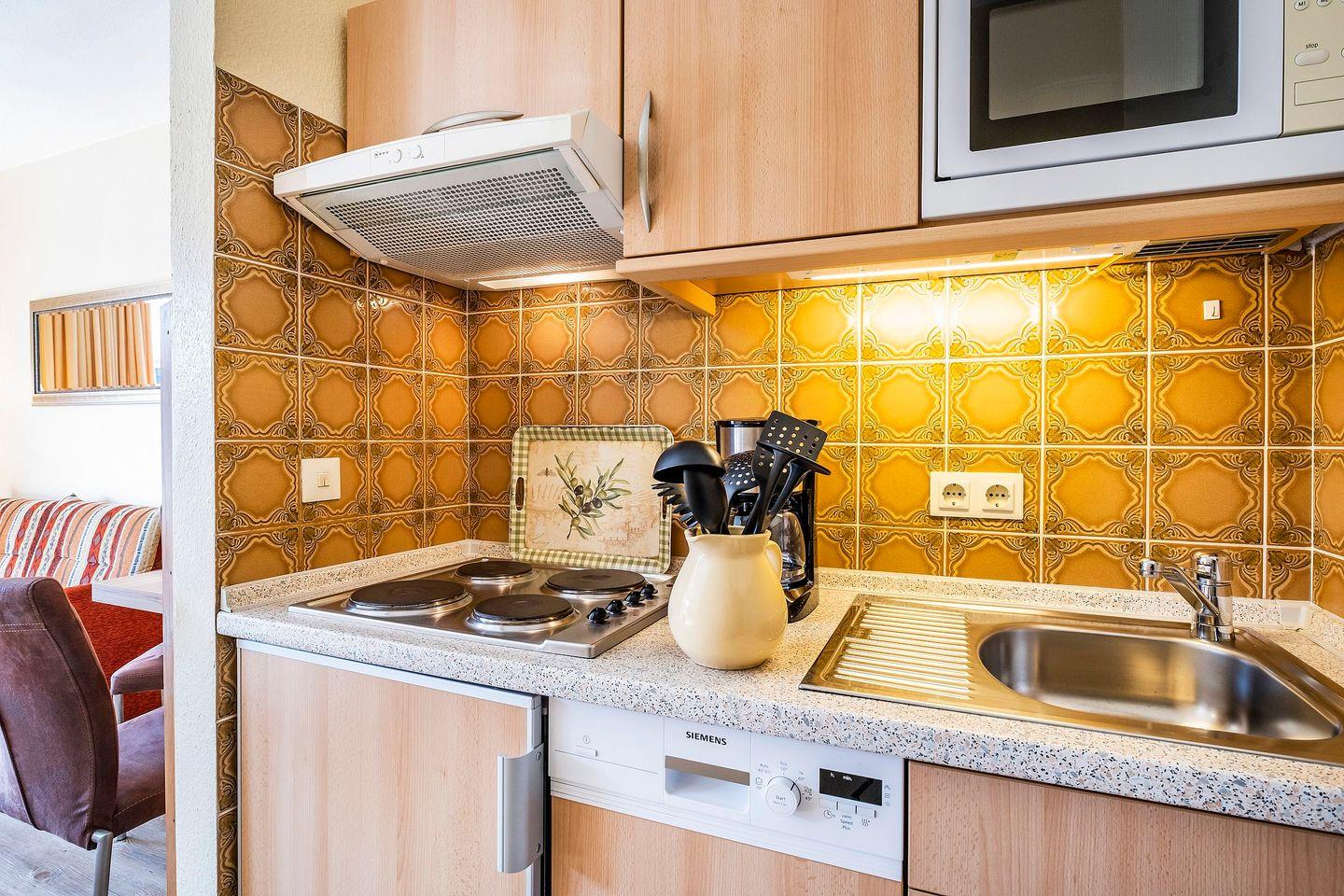 Küchenzeile: Geschirrspüler, Kochfeld, Mikrowelle, Kühlschrank mit Gefrierfunktion, Heißwasserkocher, Kaffeemaschine, Toaster.