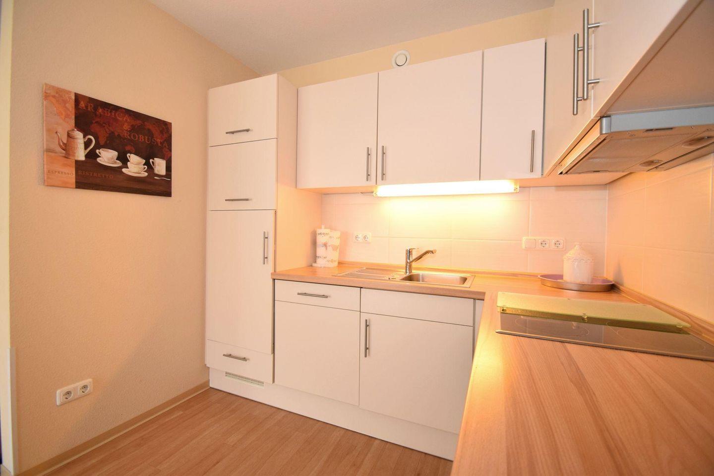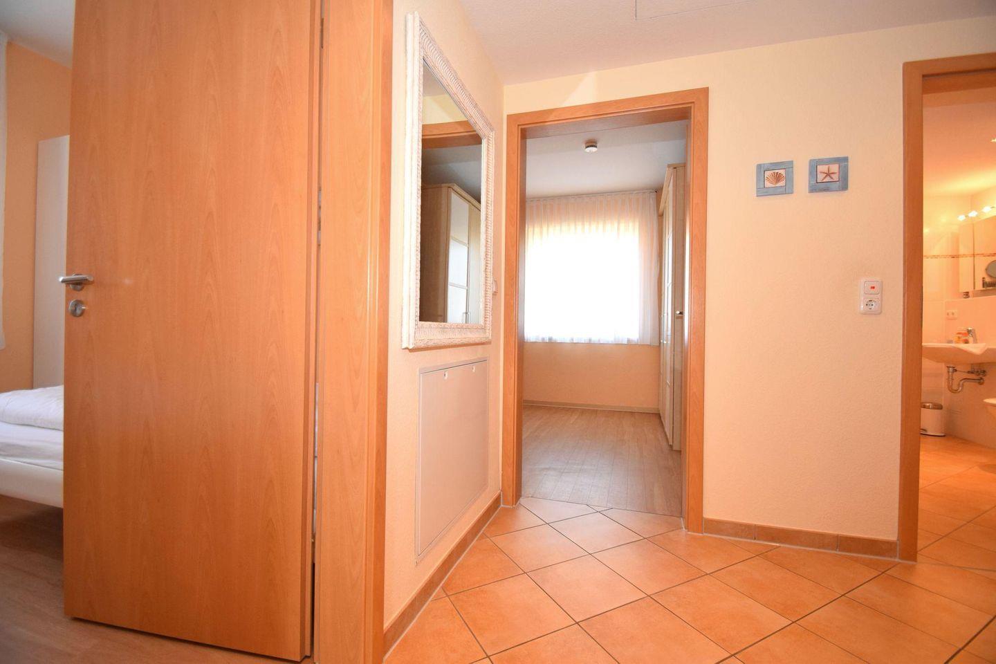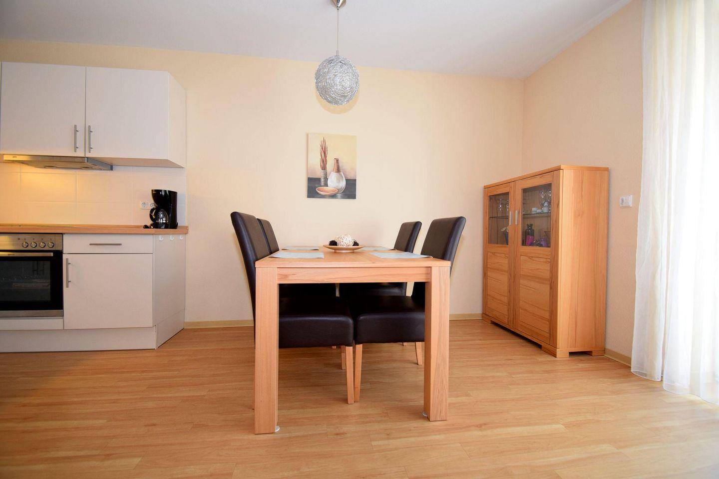 Die Ferienwohnung 1.1 (71qm) liegt im 1. Obergeschoss und ist eine helle, moderne 3-Raum-Wohnung mit Balkon in Südwest-Lage mit einer Markise. Die Küchenzeile und der Essbereich sind direkt im Wohnbereich integriert. Das Bad verfügt über eine ebenerdige Dusche/WC.