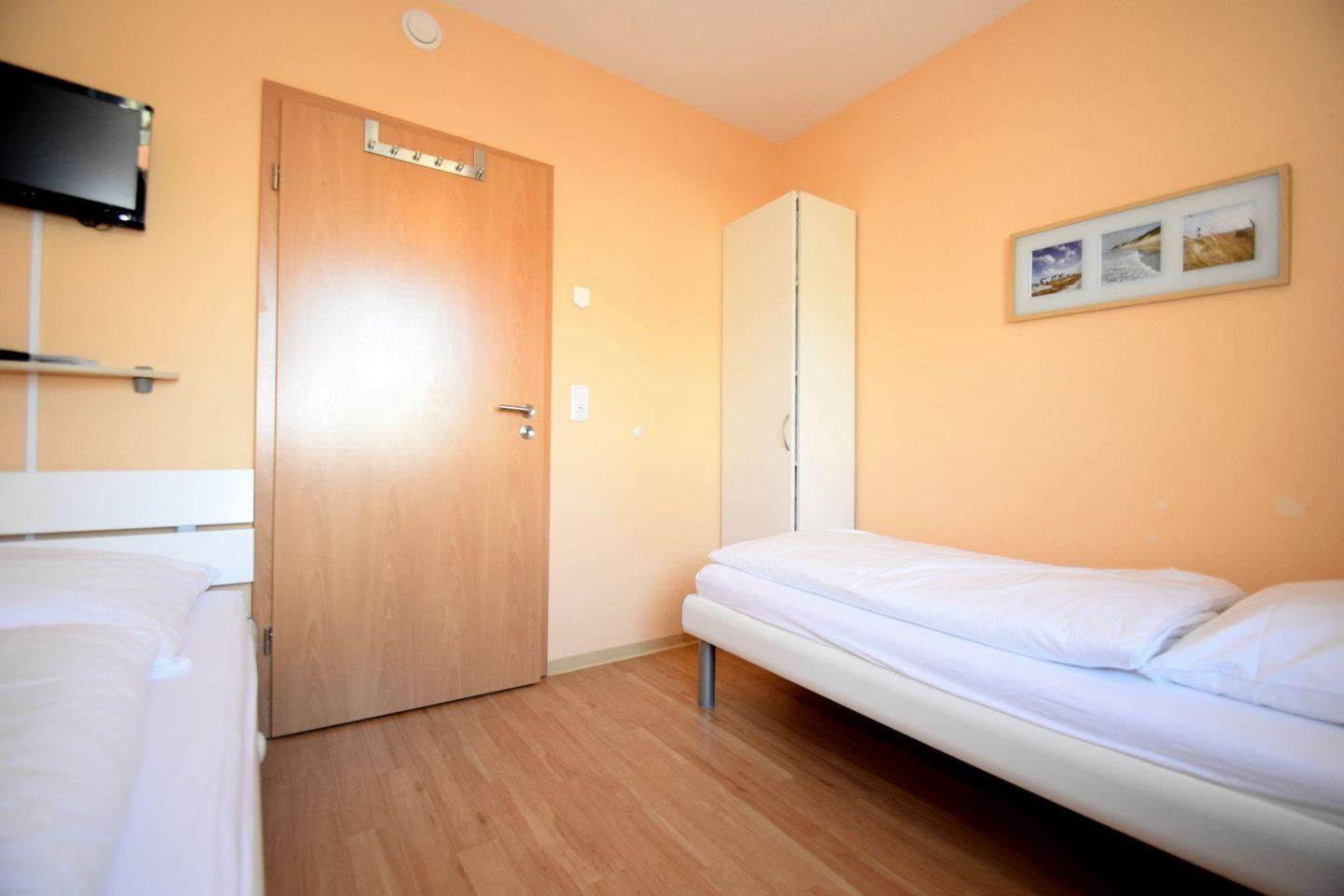 Das eine Schlafzimmer ist mit einem Doppelbett und TV ausgestattet, das andere Schlafzimmer , verfügt über 2 Einzelbetten mit TV .