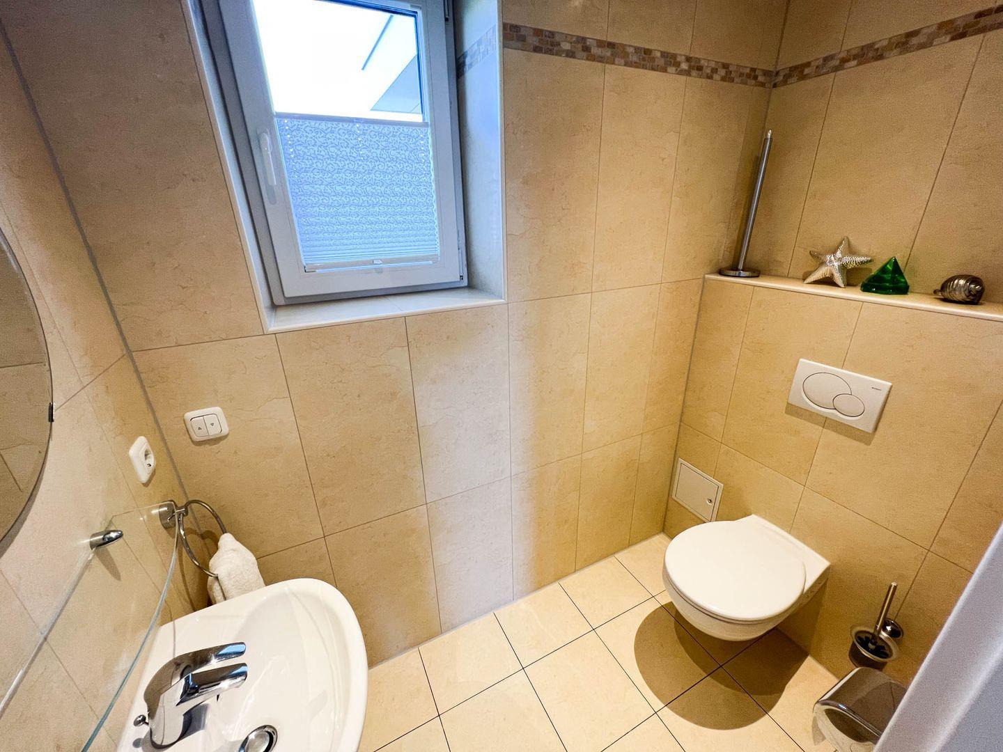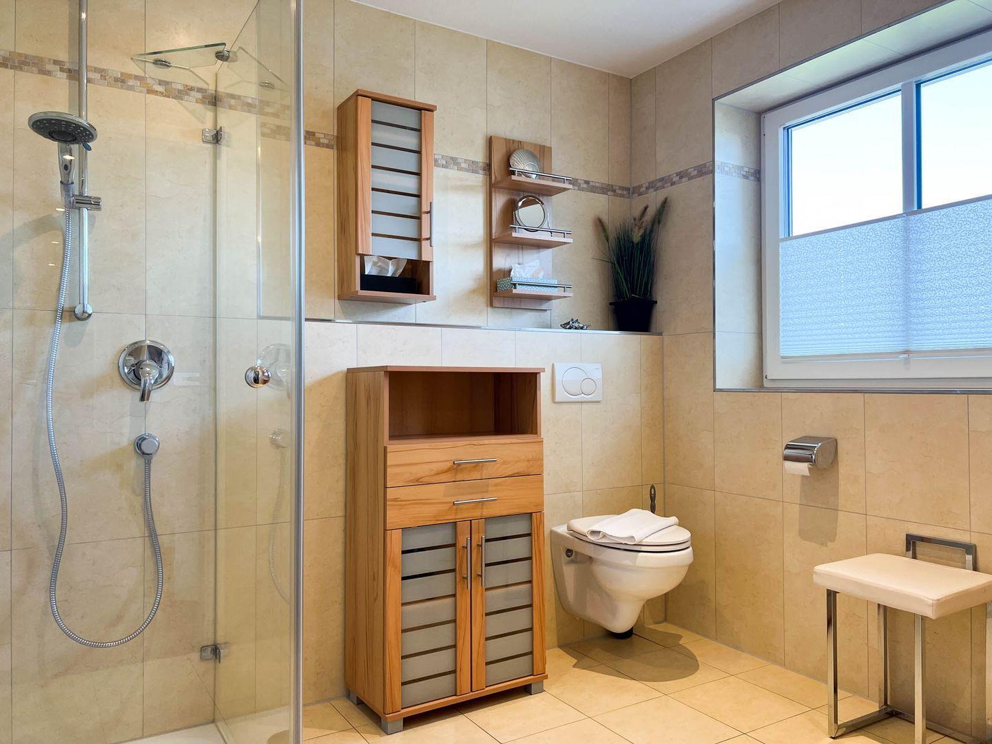 Das Bad verfügt über eine ebenerdige Dusche und die Wohnung hat ein separates Gäste-WC.