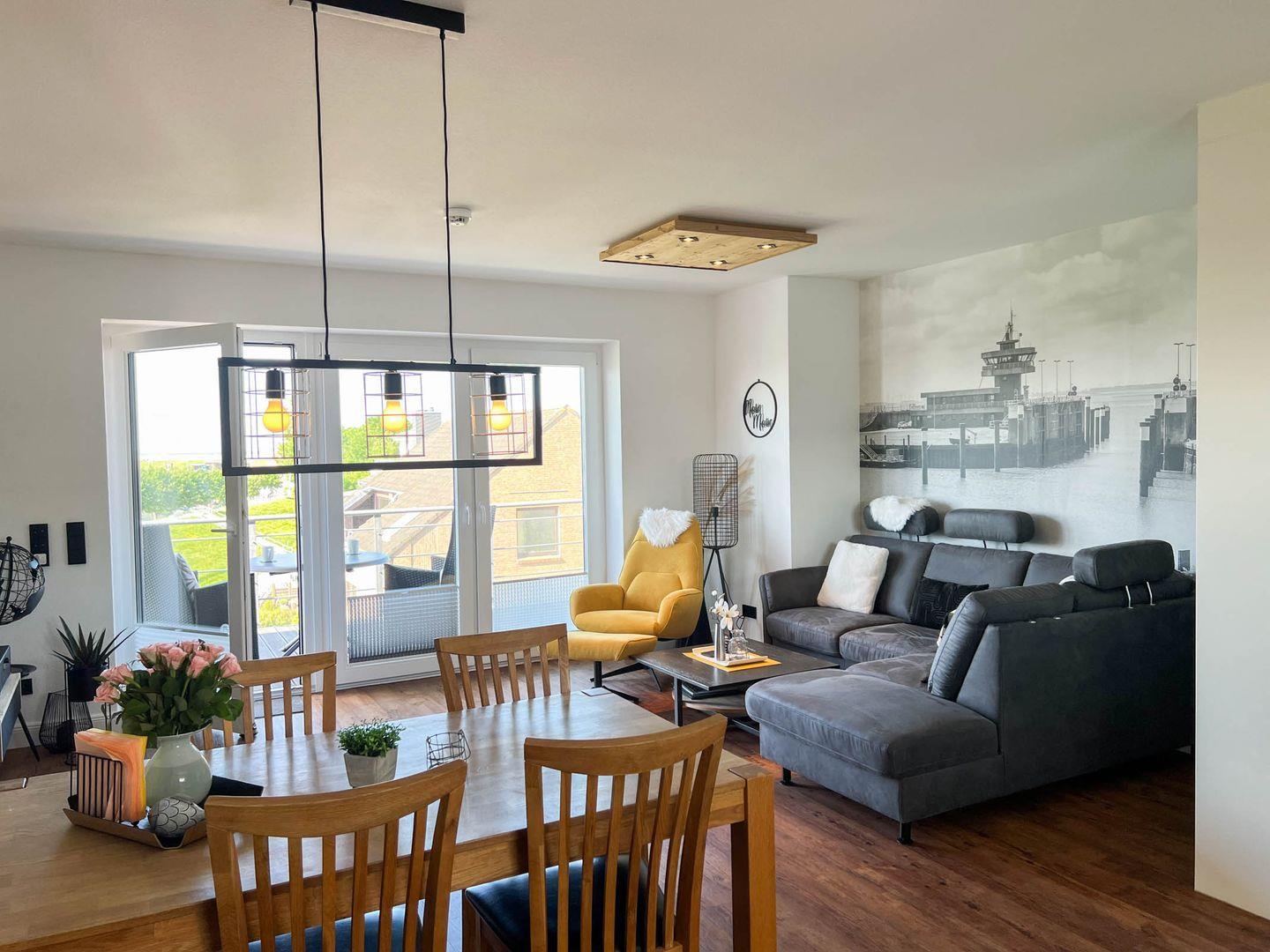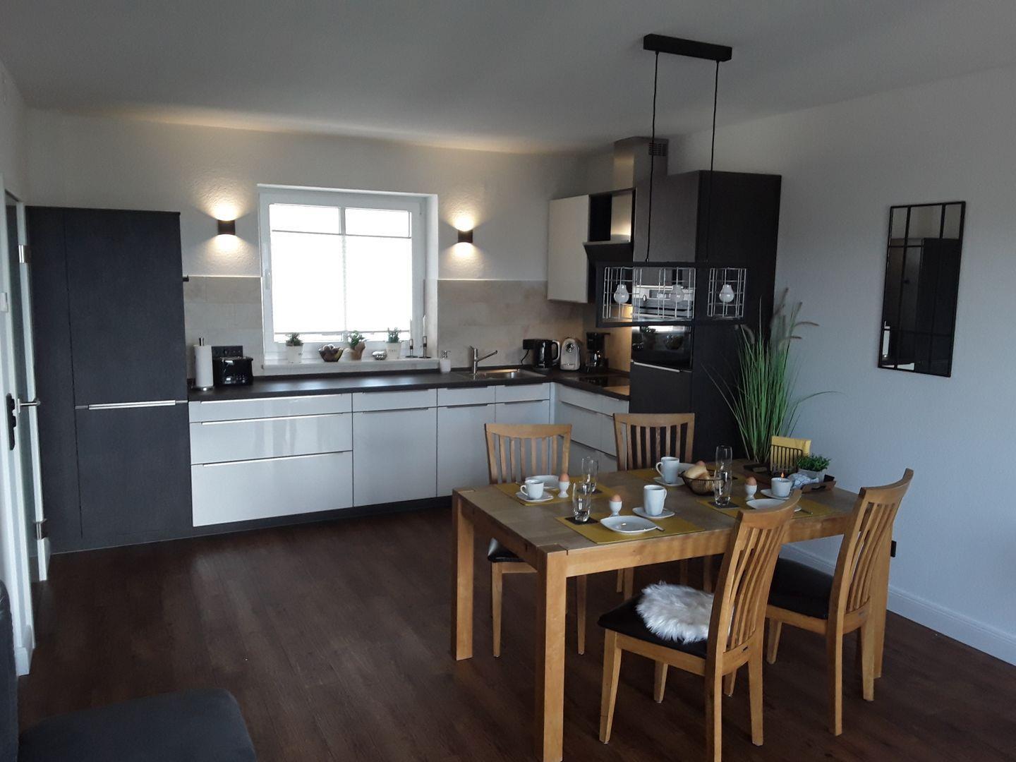 Die Ferienwohnung 3.1 (91m²) liegt im 3. Obergeschoss und ist eine helle, moderne 3-Raum-Wohnung mit Balkon in Südwest-Lage. Die Küchenzeile und der Essbereich sind direkt im Wohnbereich integriert.