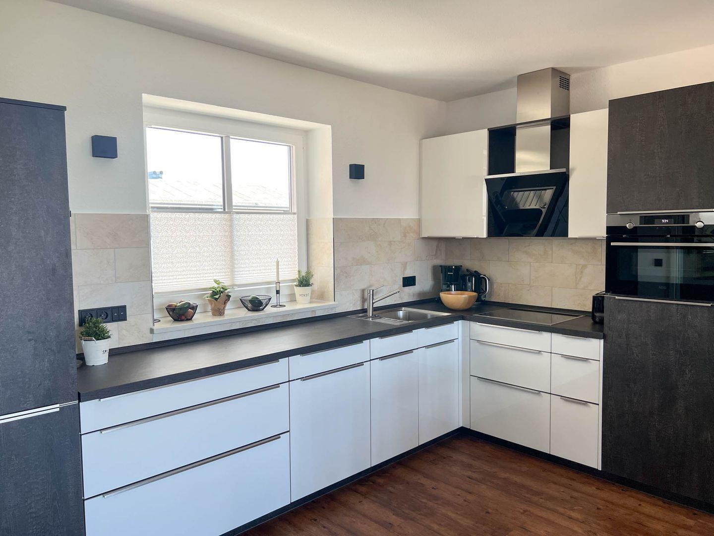 Küchenzeile: Geschirrspüler, Backofen, Kochfeld, Mikrowelle, Kühlschrank mit Gefrierfunktion, Heißwasserkocher, Kaffeemaschine, Toaster.