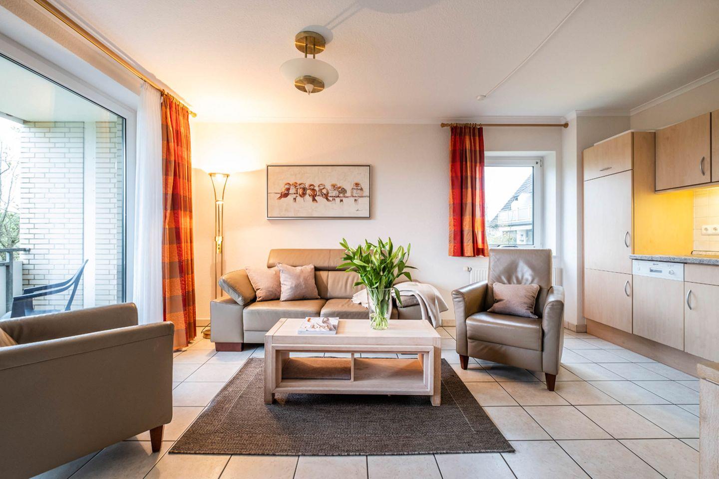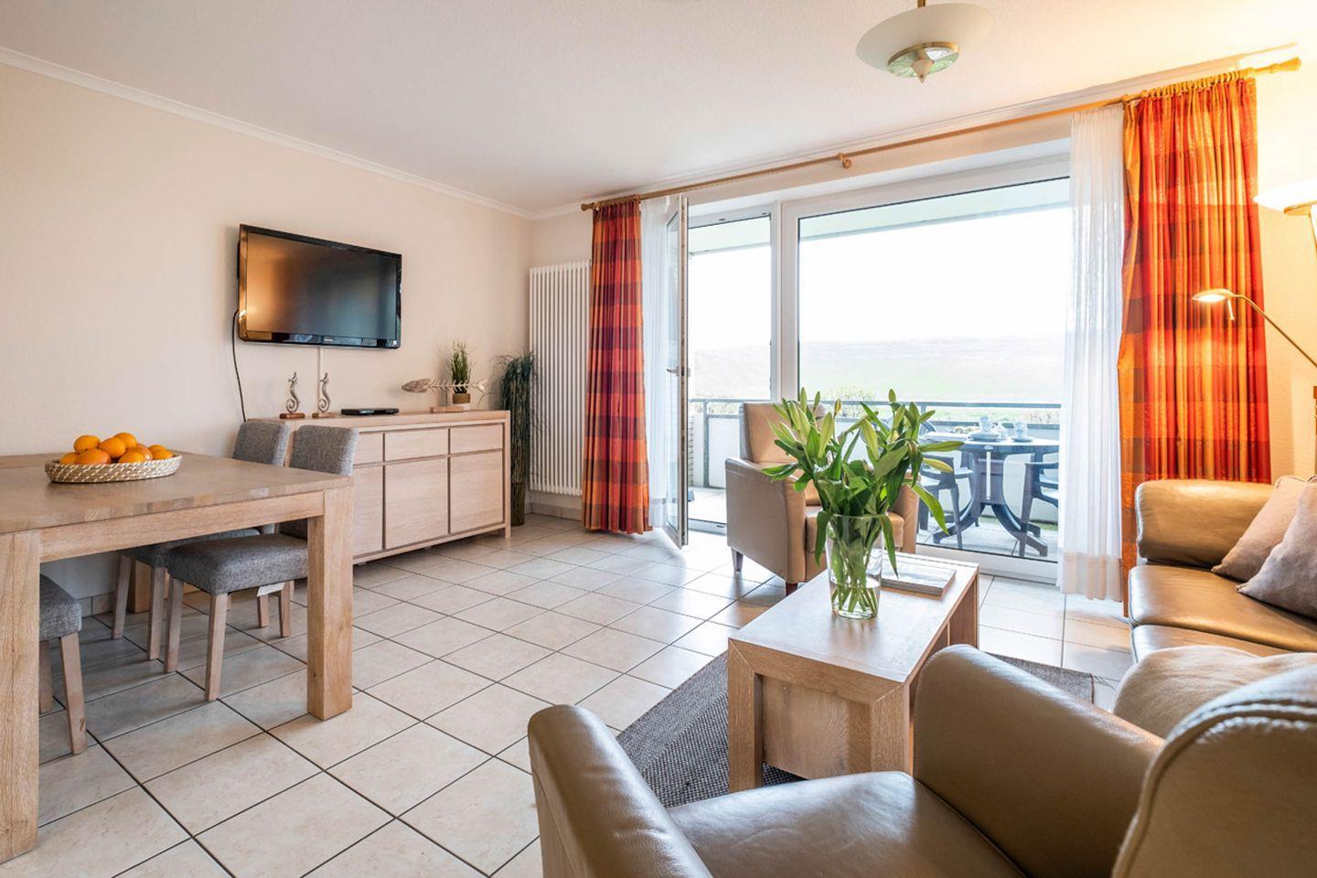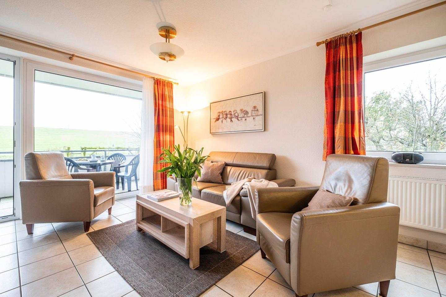 Komfortables 68?m² Nichtraucher-Apartment im Hochparterre für bis zu 4 Personen mit 2 Schlafzimmern, begehbarer Dusche und barrierefreiem Bad – perfekt geeignet auch für Gäste mit eingeschränkter Mobilität. Großzügiges Wohnzimmer mit Essbereich, Küchenzeile, Südbalkon sowie kostenloses WLAN, TV, PKW-Stellplatz und Fahrradraum. Entspannt den Tag in der hauseigenen Sauna/Dampfbad, zentral und dennoch ruhig direkt hinter dem Deich gelegen, nur wenige Schritte zum Strand, Kurpark und Bäcker