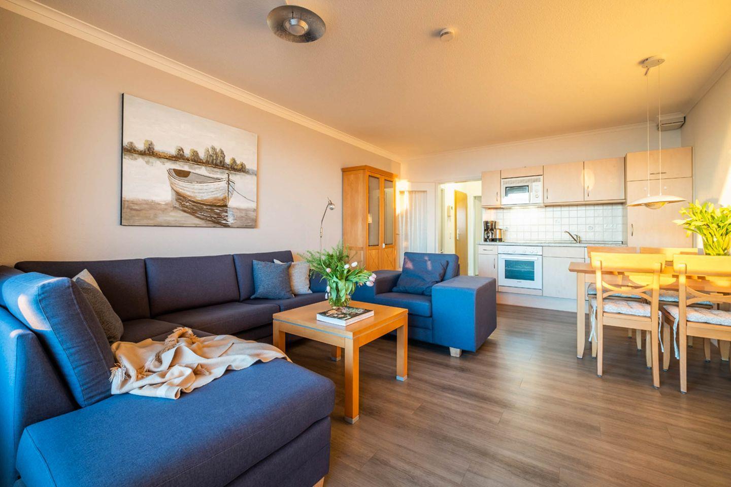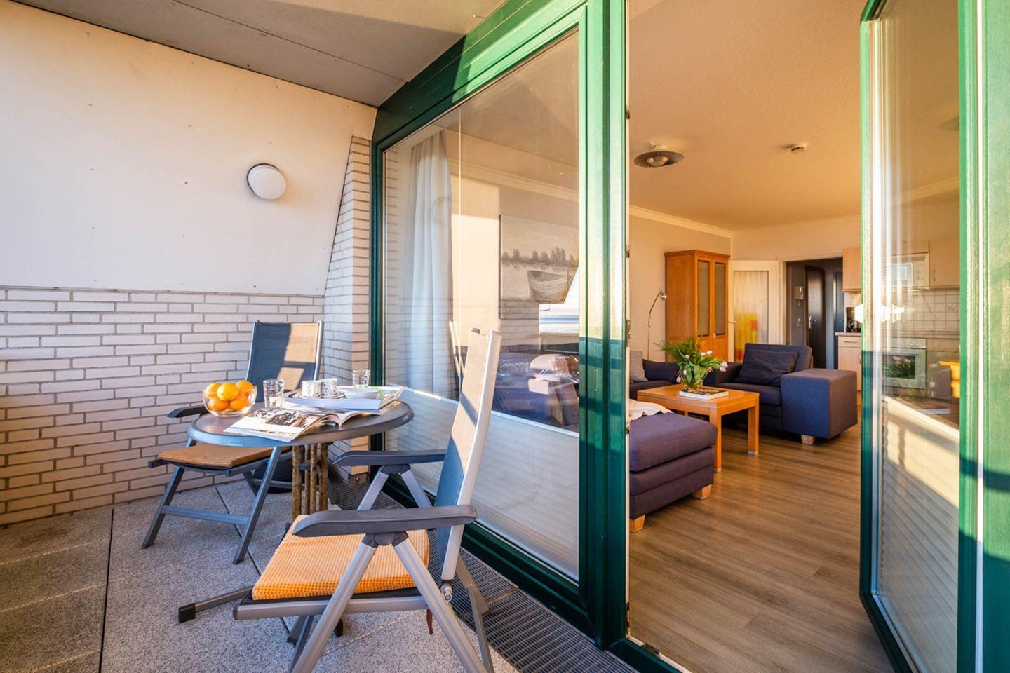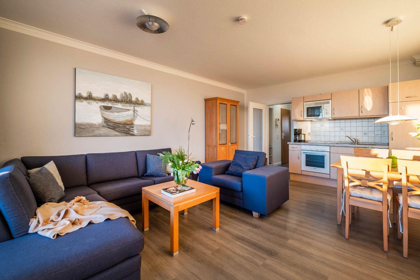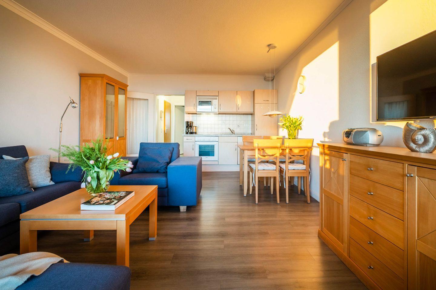 1 Wohnzimmer mit Essbereich, eine Küchenzeile, 1 Schlafzimmer mit TV und 1 Duschbad. Das Bad verfügt über eine Dusche/WC. Vom Wohnbereich gelangen Sie auf den Balkon. Das Schlafzimmer verfügt über ein Doppelbett mit elektrisch verstellbarem Lattenrost. Der Wohnung ist ein PKW-Stellplatz direkt am Haus zugehörig.
