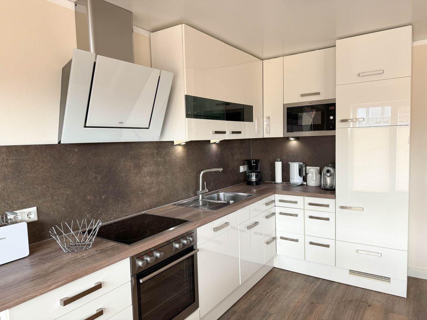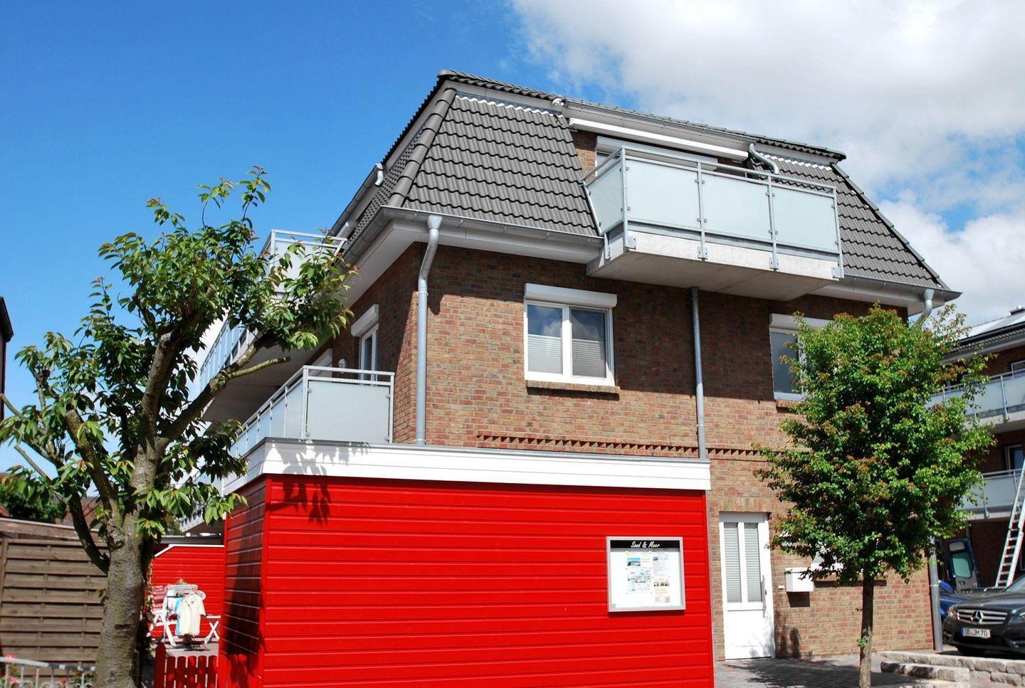 Dieses exklusive Penthouse-Appartement Nr. 5 hat eine Größe von 130 m² und befindet sich im Dachgeschoss des Hauses "Sand und Meer". Es verfügt über 2 großzügige Balkone. Das Haus hat auch einen Fahrstuhl, der Sie nicht nur in die Etage, sondern direkt in Ihr Appartement bringt. Im Wohnzimmer finden Sie eine gemütliche Couchgarnitur und einen Ohrensessel mit Hocker vor. Die Küche und der Essbereich sind im Wohnbereich integriert. Beide Schlafzimmer sind mit Boxspringbetten (Übergröße 2.00 x 2.20 m) und TV ausgestattet und verfügen über ihr eigenes Duschbad, welches direkt über das jeweilige Schlafzimmer zu erreichen ist. Beide Bäder sind mit barrierefreier, begehbarer Dusche (1x Duscheingangsbreite 70 cm, 1 x Duscheingangsbreite 77 cm) ausgestattet. Das Appartement verfügt zusätzlich über ein Gäste-WC in dem sich eine Waschmaschine und ein Trockner (Münzenautomat) befinden. Alle Türen haben eine Breite von 81,5 cm. Ein Abstellraum befindet im Appartement. Das Appartement ist mit Fußbodenheizung , elektrischen Außenjalousien und Markise ausgestattet. Vom Wohnzimmer und einem der Schlafzimmer gelangen Sie auf den großen Balkon, der im Südwesten liegt und einen Teilmeerblick hat. Den kleinen Balkon im Südosten erreichen Sie über das andere Schlafzimmer.