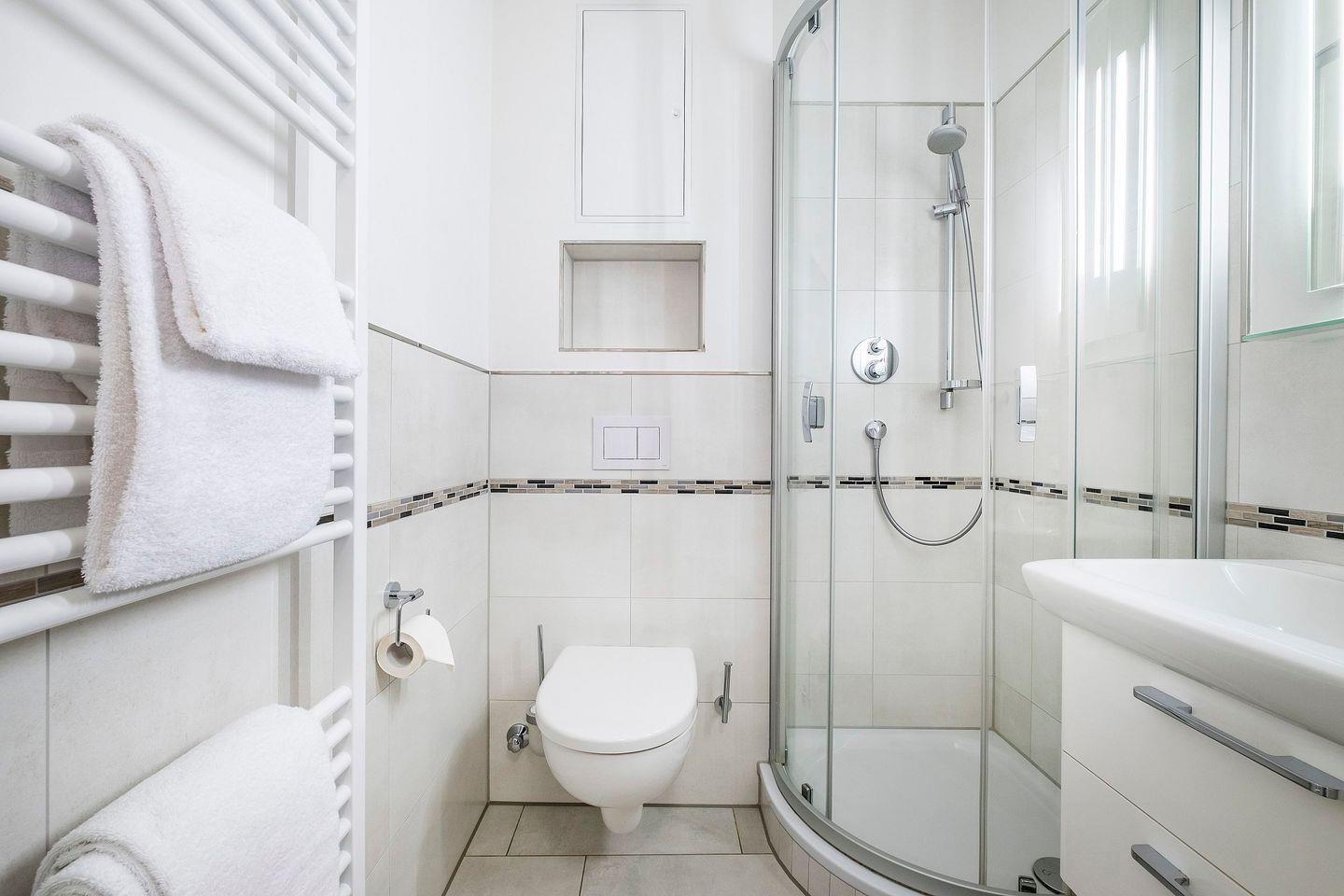 Zusätzlich verfügt die Ferienwohnung über ein stilvolles Badezimmer mit Dusche, wo Sie nach einem erholsamen Tag in der Natur entspannen können. Die Waschmaschine und der Trockner befinden sich in einem Gemeinschaftsbereich und sind optimal für längere Aufenthalte.