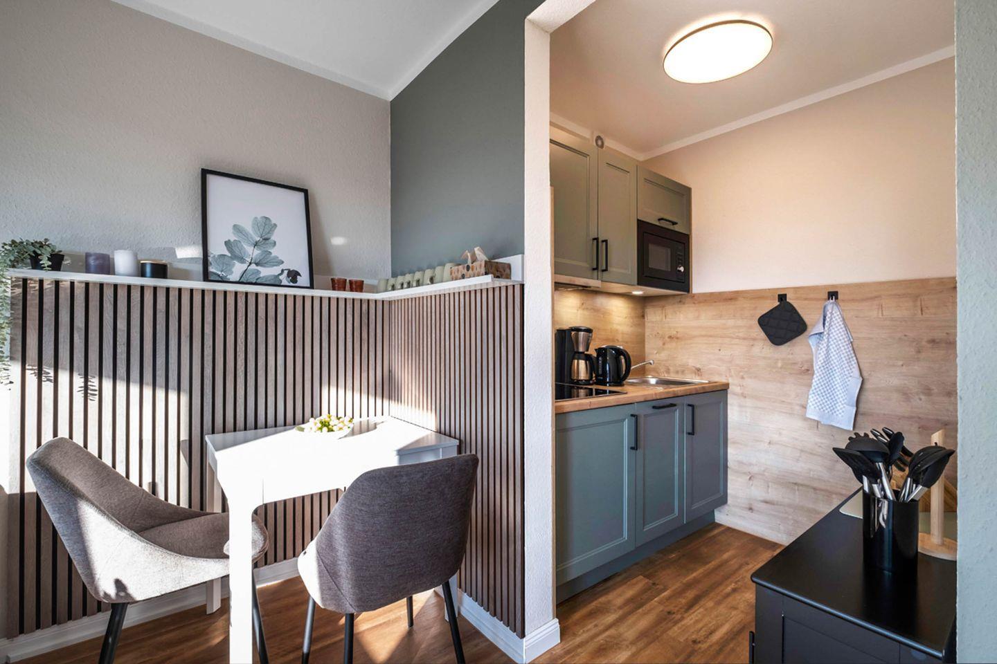 Ein großzügiges Schlafzimmer mit dazugehörigem Wohnzimmer lädt zum Entspannen ein. Die offene Küchenzeile, die zum Wohnzimmer führt, ist mit modernen Annehmlichkeiten ausgestattet, darunter ein Kühlschrank, ein Herd, eine Mikrowelle, eine Spülmaschine und sogar eine Kaffeemaschine – perfekt, um sich nach einem erlebnisreichen Tag eine kleine Mahlzeit oder einen Kaffee zu gönnen.