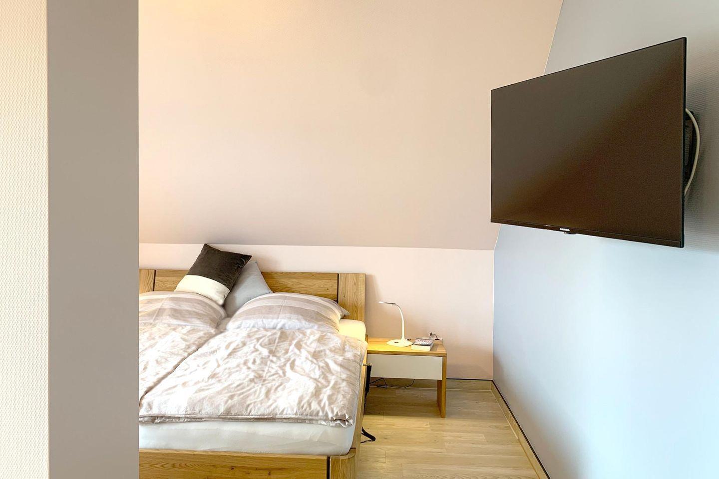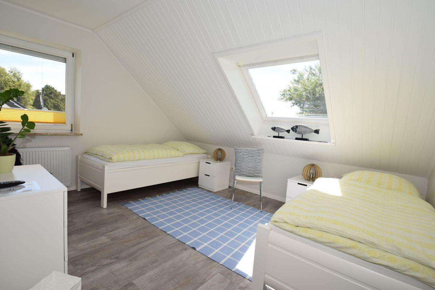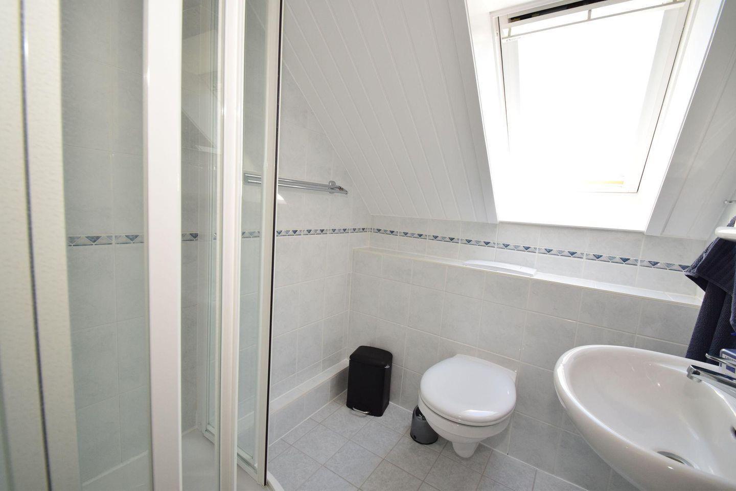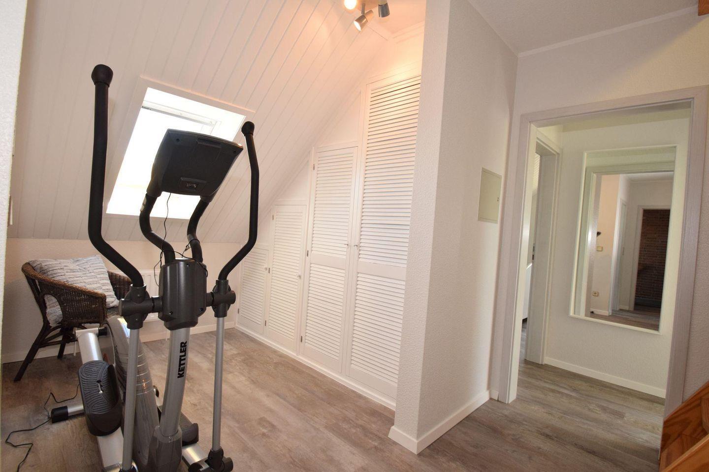 Im Dachgeschoß befinden sich 3 Schlafzimmer. 1 Schlafzimmer mit 2 Einzelbetten und TV und zwei weitere Schlafzimmer mit jeweils Doppelbett und TV. Das Boxspringbett in einem der Schlafzimmer hat elektrisch verstellbare Lattenroste. Auf dem Flur befindet sich ein großzügiger Einbauschrank und auch ein Kettler-Crosstrainer ist vorhanden. Das Dachgeschoss verfügt auch über ein kleines Bad mit Dusche.