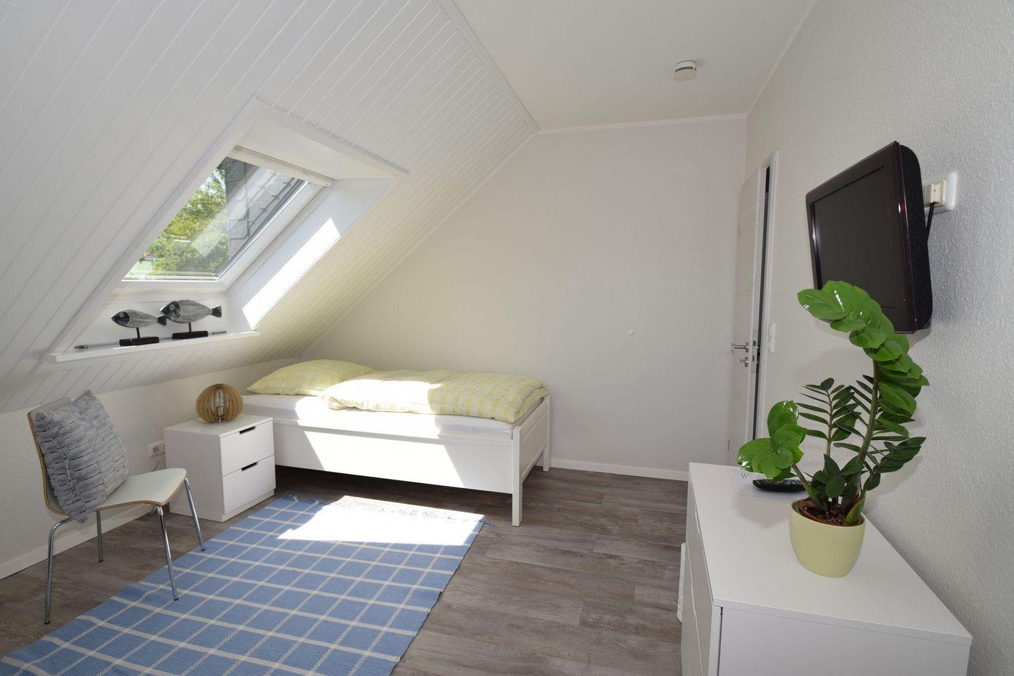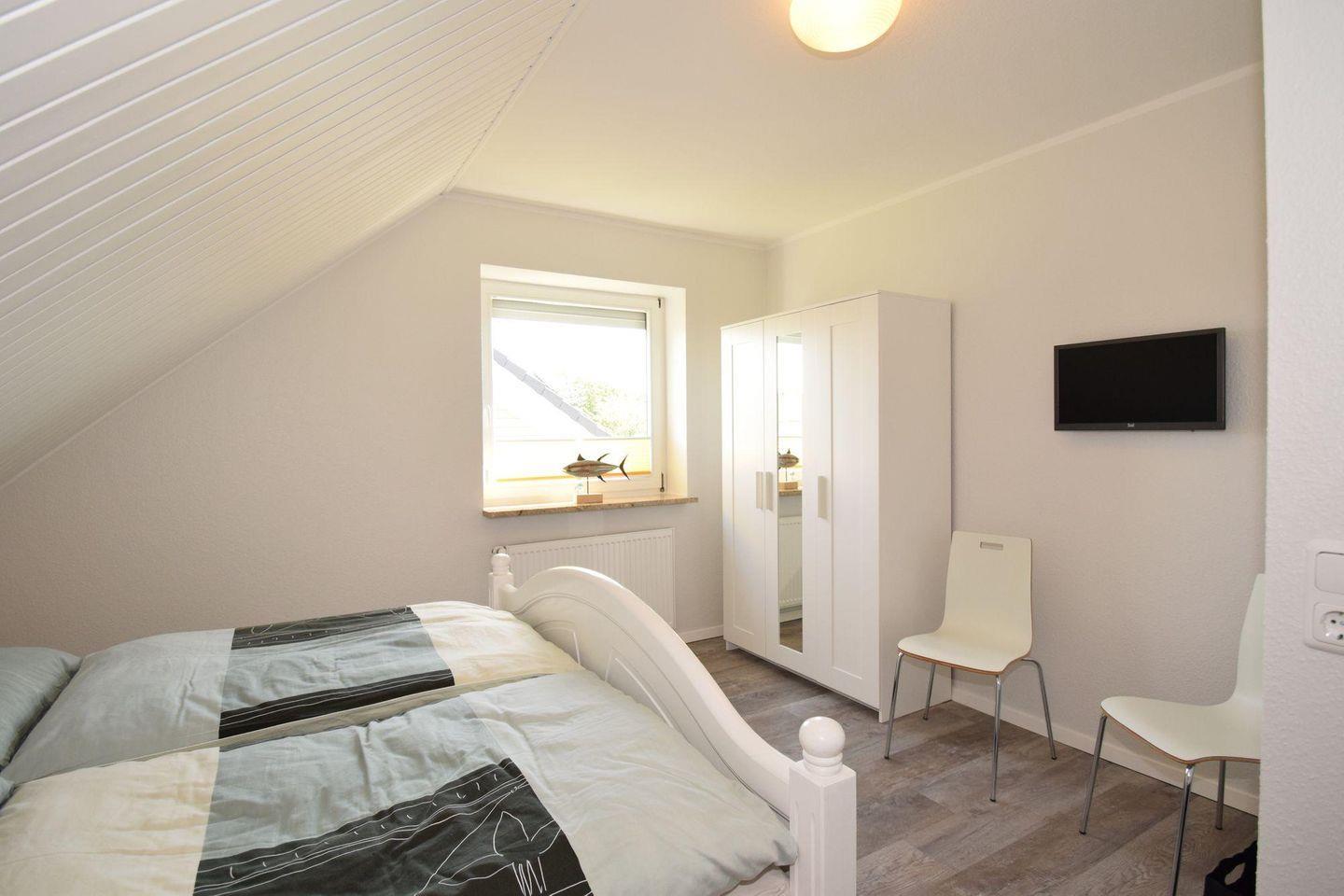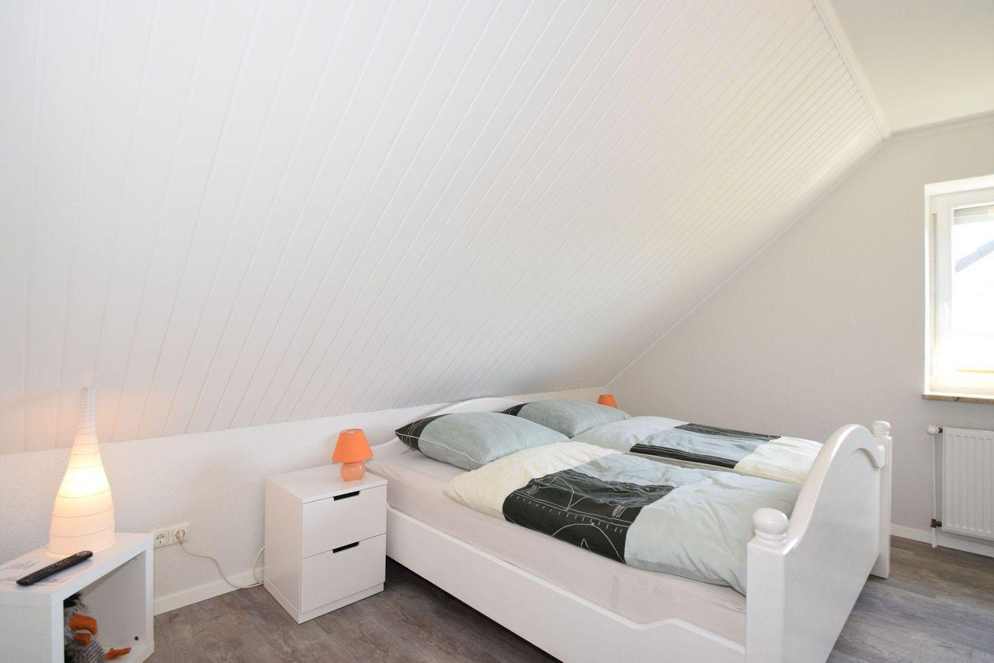 Im Dachgeschoß befinden sich 3 Schlafzimmer. 1 Schlafzimmer mit 2 Einzelbetten und TV und zwei weitere Schlafzimmer mit jeweils Doppelbett und TV. Das Boxspringbett in einem der Schlafzimmer hat elektrisch verstellbare Lattenroste. Auf dem Flur befindet sich ein großzügiger Einbauschrank und auch ein Kettler-Crosstrainer ist vorhanden. Das Dachgeschoss verfügt auch über ein kleines Bad mit Dusche.
