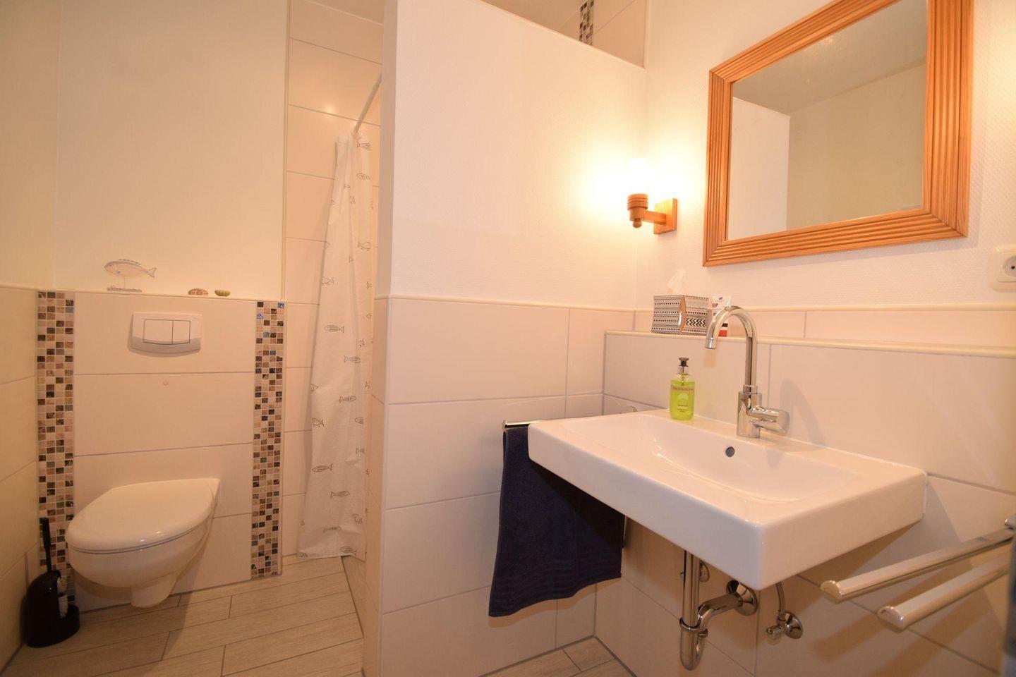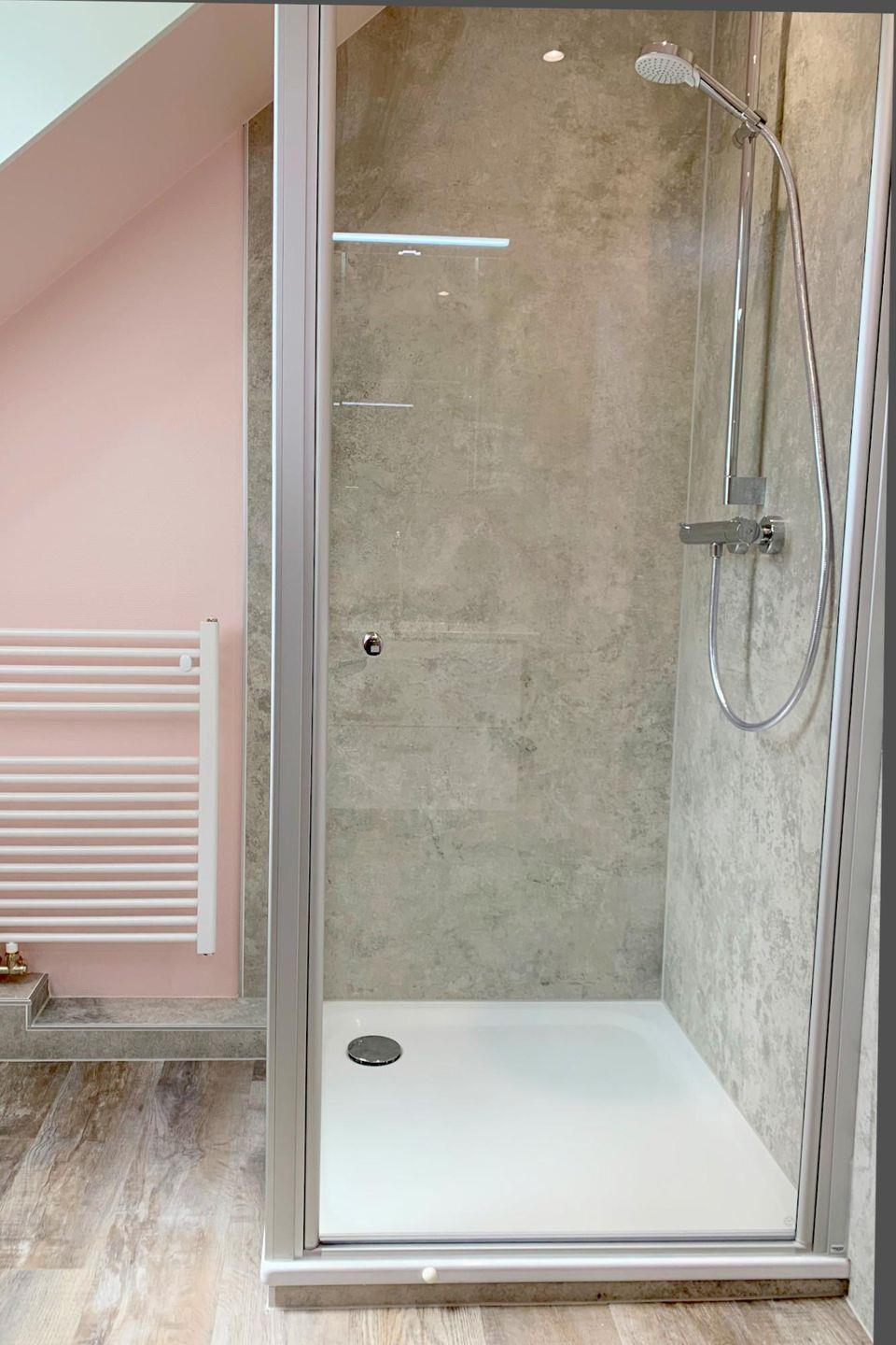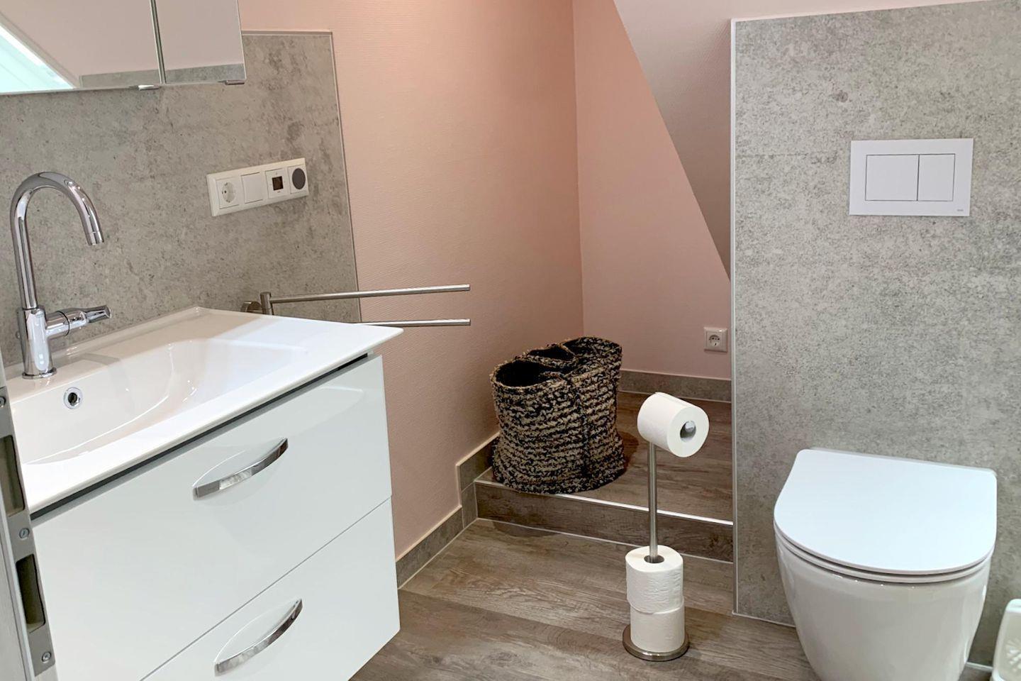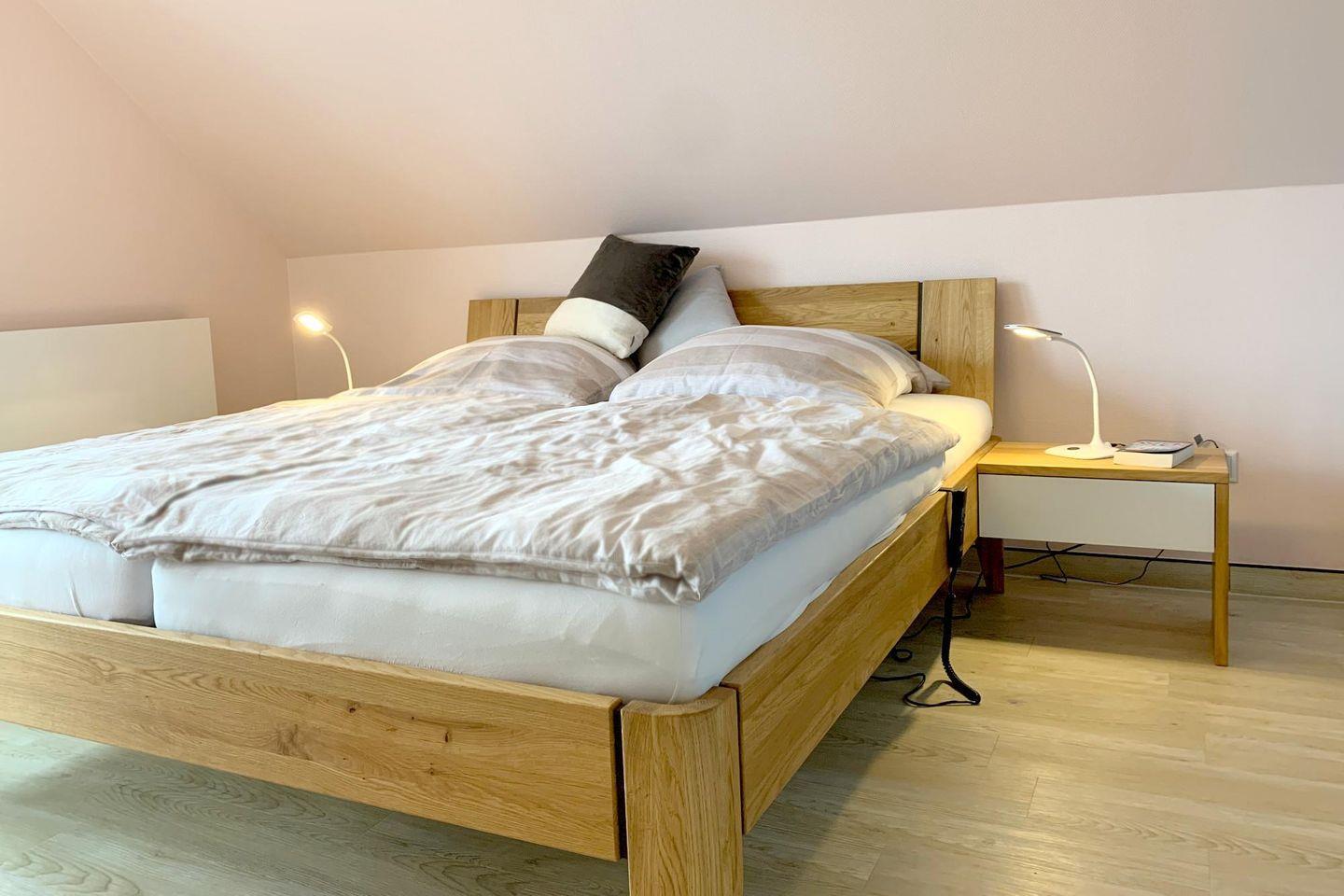 Im Dachgeschoß befinden sich 3 Schlafzimmer. 1 Schlafzimmer mit 2 Einzelbetten und TV und zwei weitere Schlafzimmer mit jeweils Doppelbett und TV. Das Boxspringbett in einem der Schlafzimmer hat elektrisch verstellbare Lattenroste. Auf dem Flur befindet sich ein großzügiger Einbauschrank und auch ein Kettler-Crosstrainer ist vorhanden. Das Dachgeschoss verfügt auch über ein kleines Bad mit Dusche.