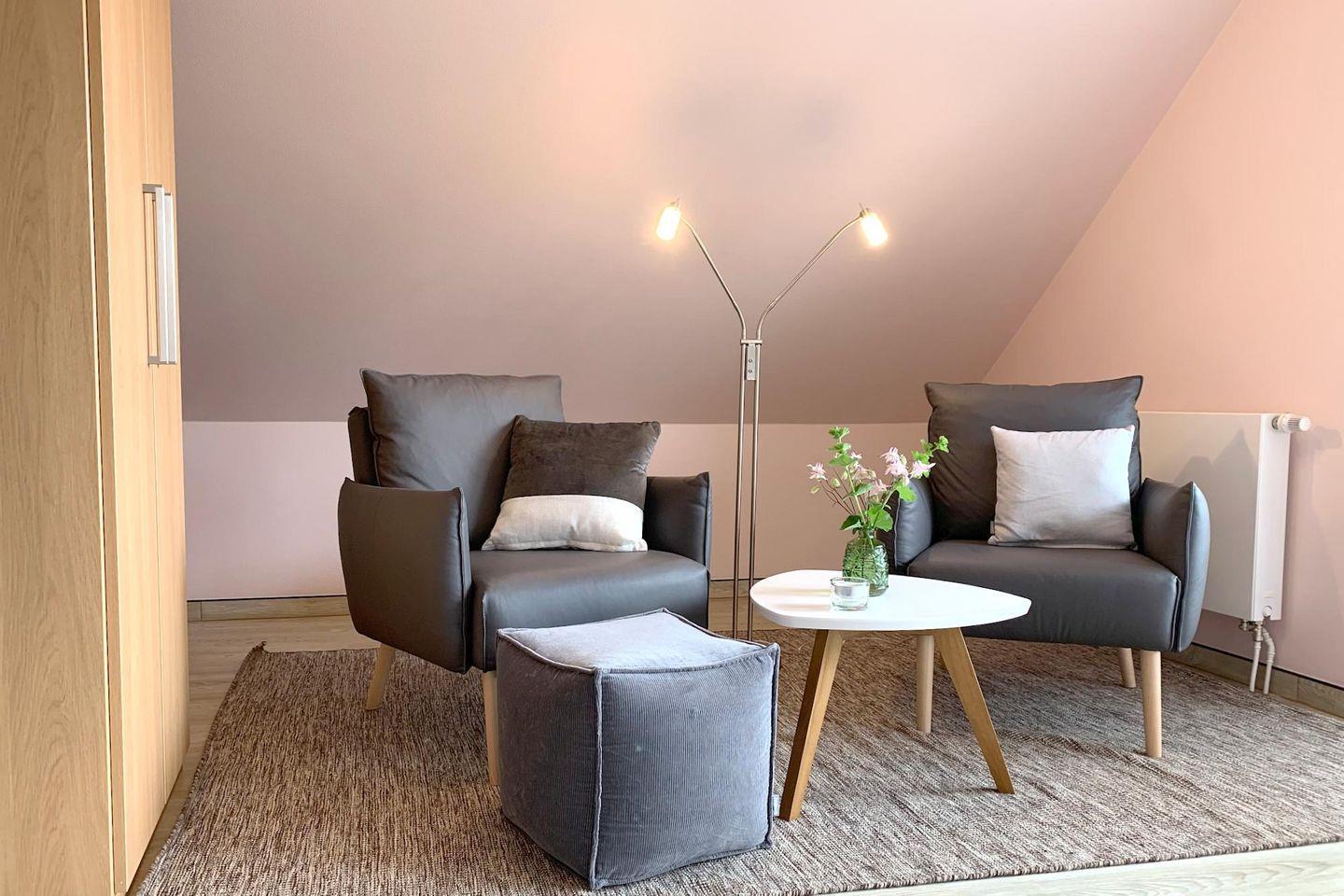 Für die 7. und 8. Person befindet sich im Dachgeschoss ein separates 1-Raum-Appartement (ca. 35 qm) mit einem Flur, Wohn-/Schlafraum, Duschbad und Balkon. Der Wohn-/Schlafraum besitzt ein Klimagerät. Da dieses Appartement zugänglich über denselben Eingang des Hauses ist, kann es nur von den Mietern des Hauses dazu gebucht werden. Der Tagespreis für das Appartement liegt bei 70,- €. Somit kann das Haus mit insgesamt 8 Personen belegt werden!