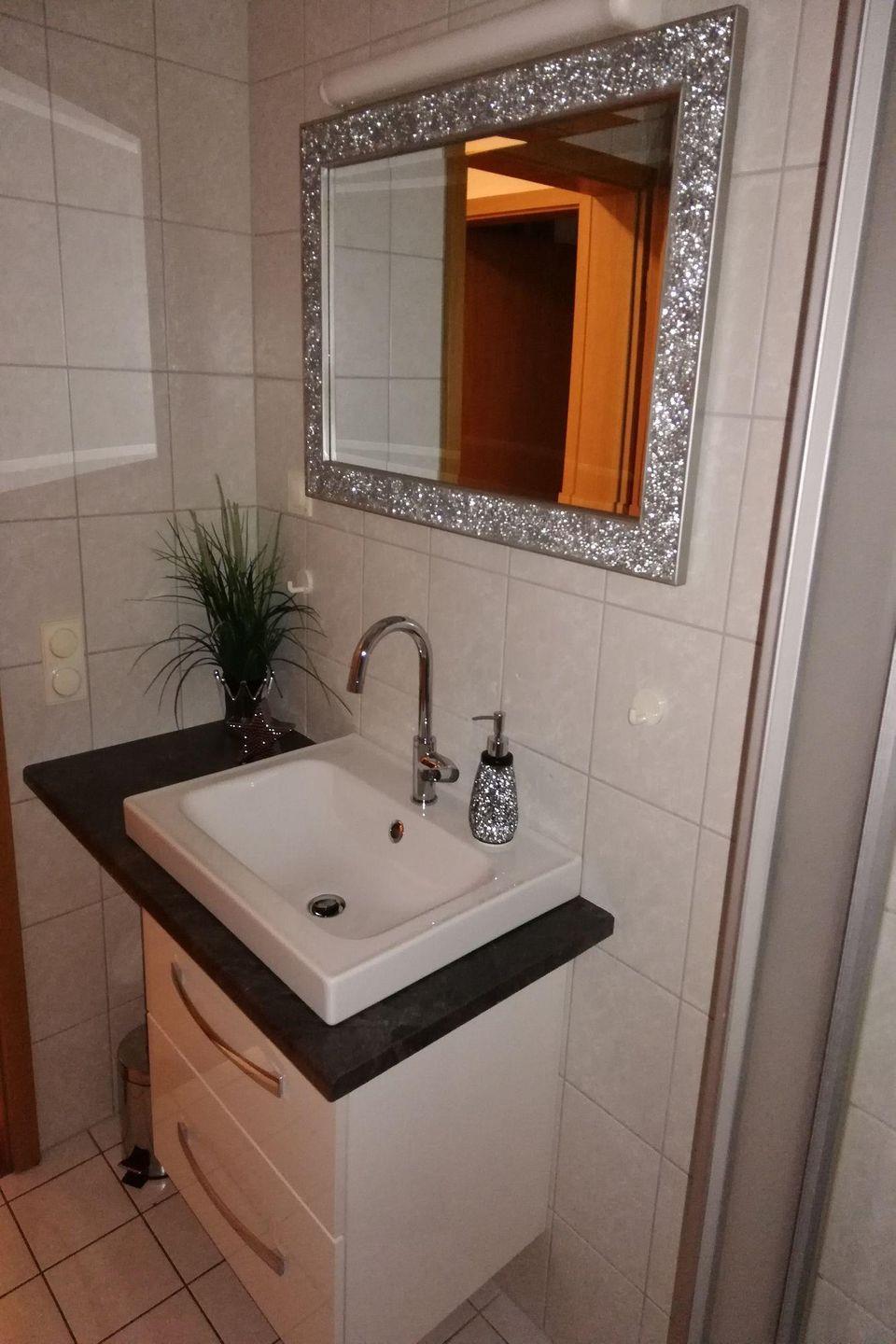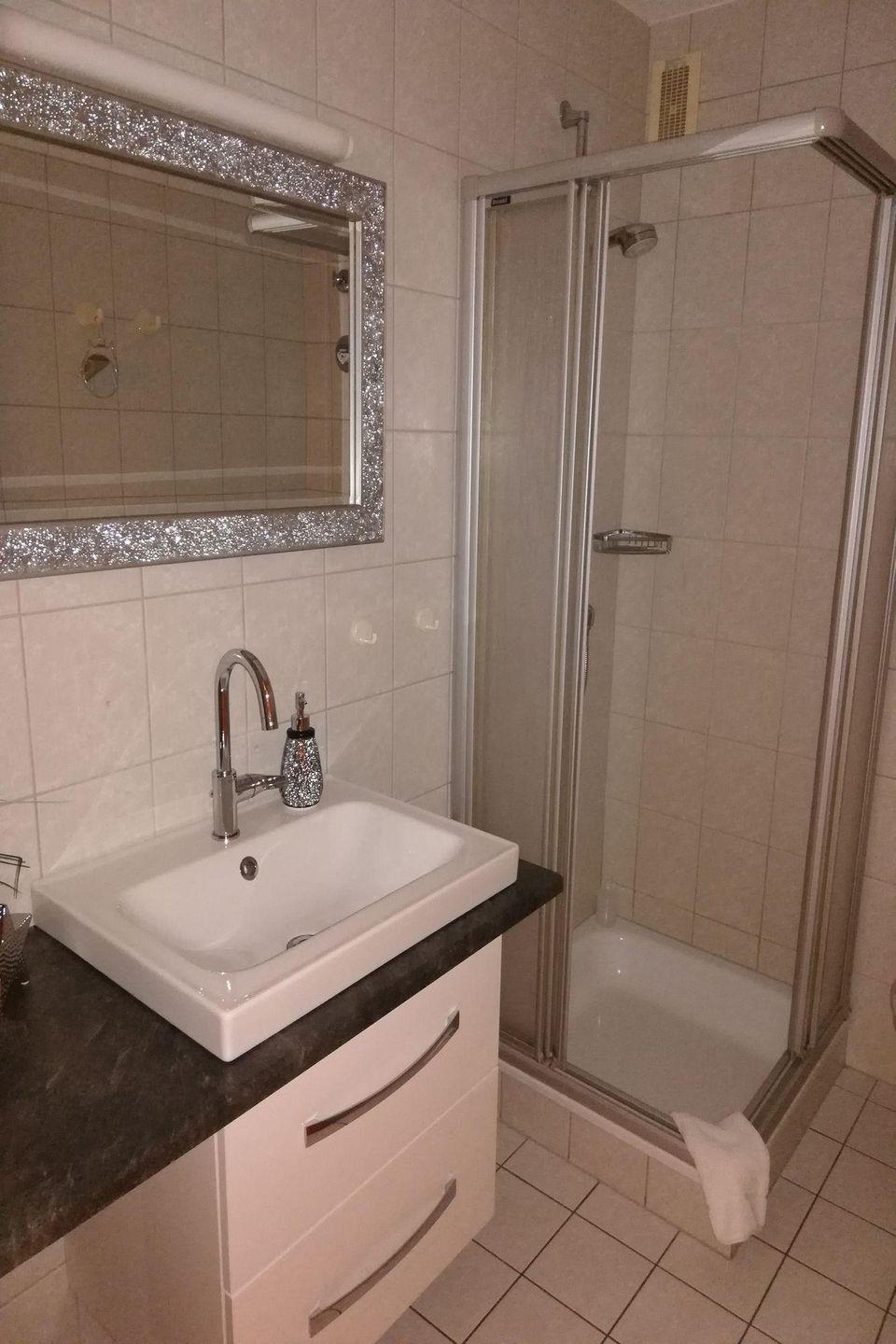 Das helle Bad verfügt über eine Dusche und ein WC.