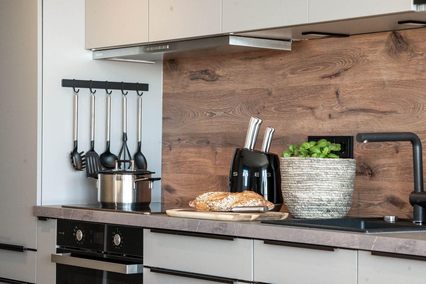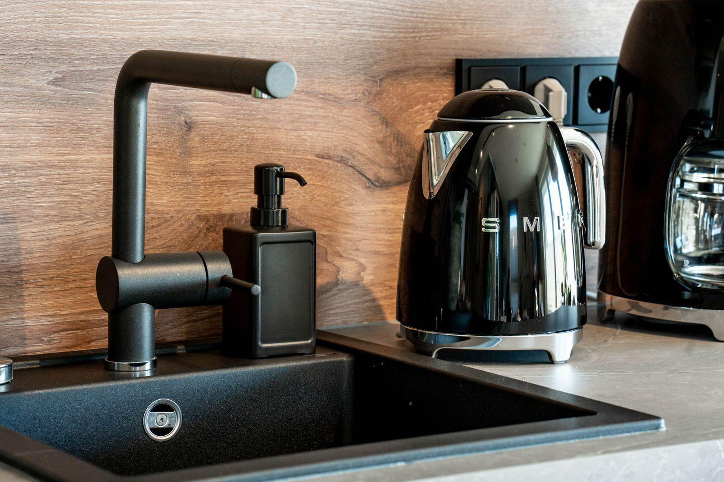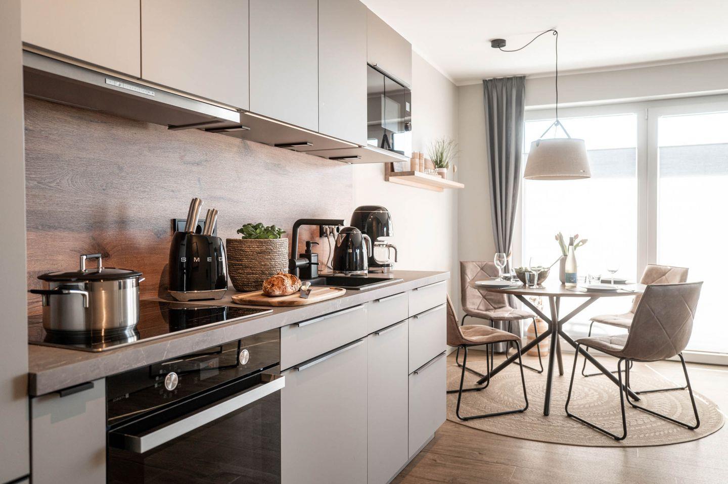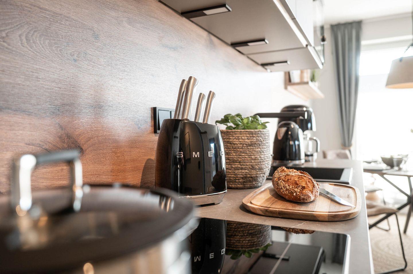 Küche: NEU, ausgestattet mit Markengeräten, induktionskochfeld, Backofen, Kühl-Gefrierkombination, Geschirrspüler, Mikrowelle, Wasserkocher, Eierkocher, Filterkaffeemaschine