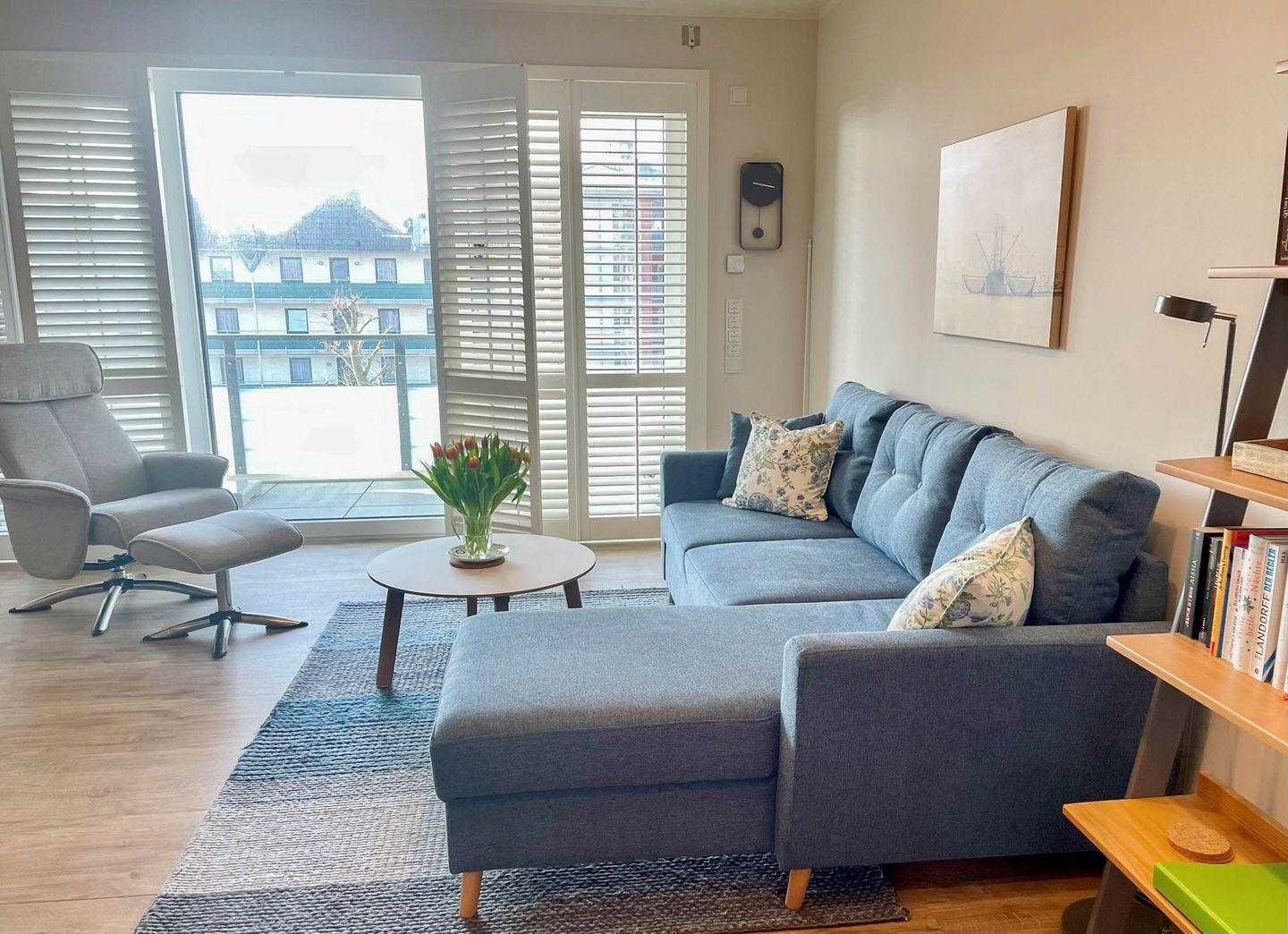 Das zur Südseite gelegene Wohnzimmer ist mit einem Relax Sessel und einem gemütlichen Schlafsofa (Liegefläche 140 cm x 200 cm) mit Ottomane ausgestattet und verfügt über elegante Innenfensterläden (Shutter). Diese sind der optimale Sonnenschutz zur Regulierung von Licht und Privatsphäre. Die Lamellen können in jede gewünschte Position gekippt oder die Paneele gänzlich aufgeklappt werden. So passen Sie das Sonnenlicht im Handumdrehen Ihren Wünschen an und verhindern, dass sich der Raum im Sommer zu stark erhitzt.