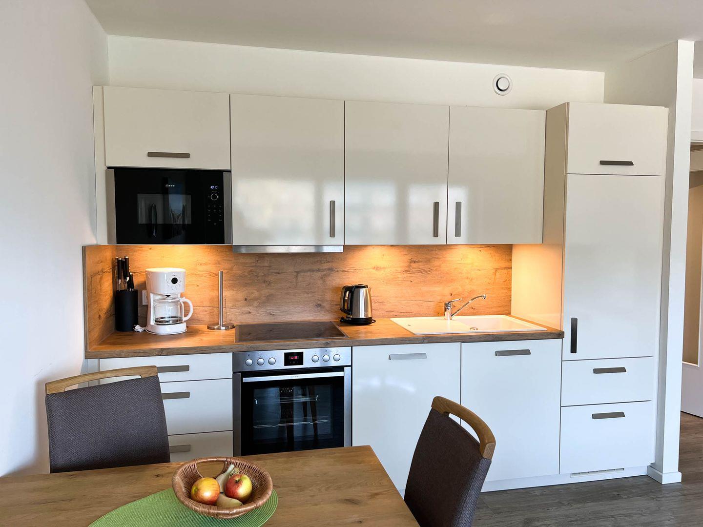 Küche: Backofen, Cerankochfeld, Mikrowelle, Geschirrspüler, Kühl- Gefrierkombination, Kaffeemaschine, Wasserkocher, Toaster