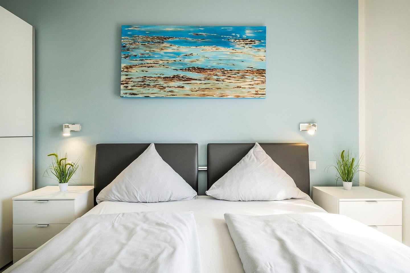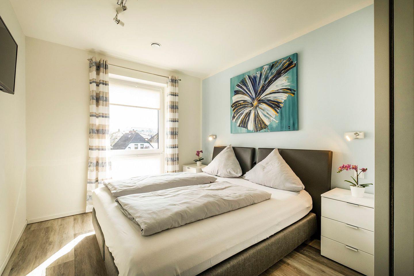 Die Wohnung hat 2 Schlafzimmer, die jeweils mit einem Boxspringbett (180x200 cm) und einem TV ausgestattet sind.