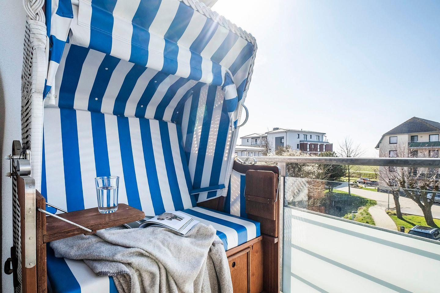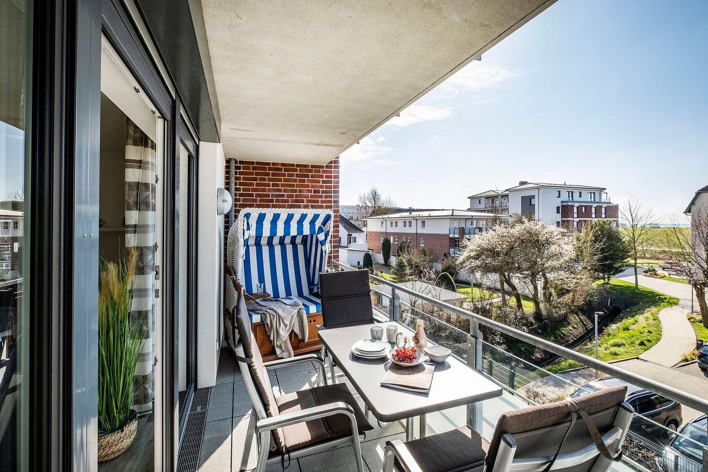 Vom Balkon aus, der mit einem Strandkorb ausgestattet ist, haben Sie Sicht auf den Deich und teils auf die Nordsee. Der Sandstrand, der Hafen und die Flaniermeile sind gut fußläufig zu erreichen, da sie sich in der Nähe befinden.