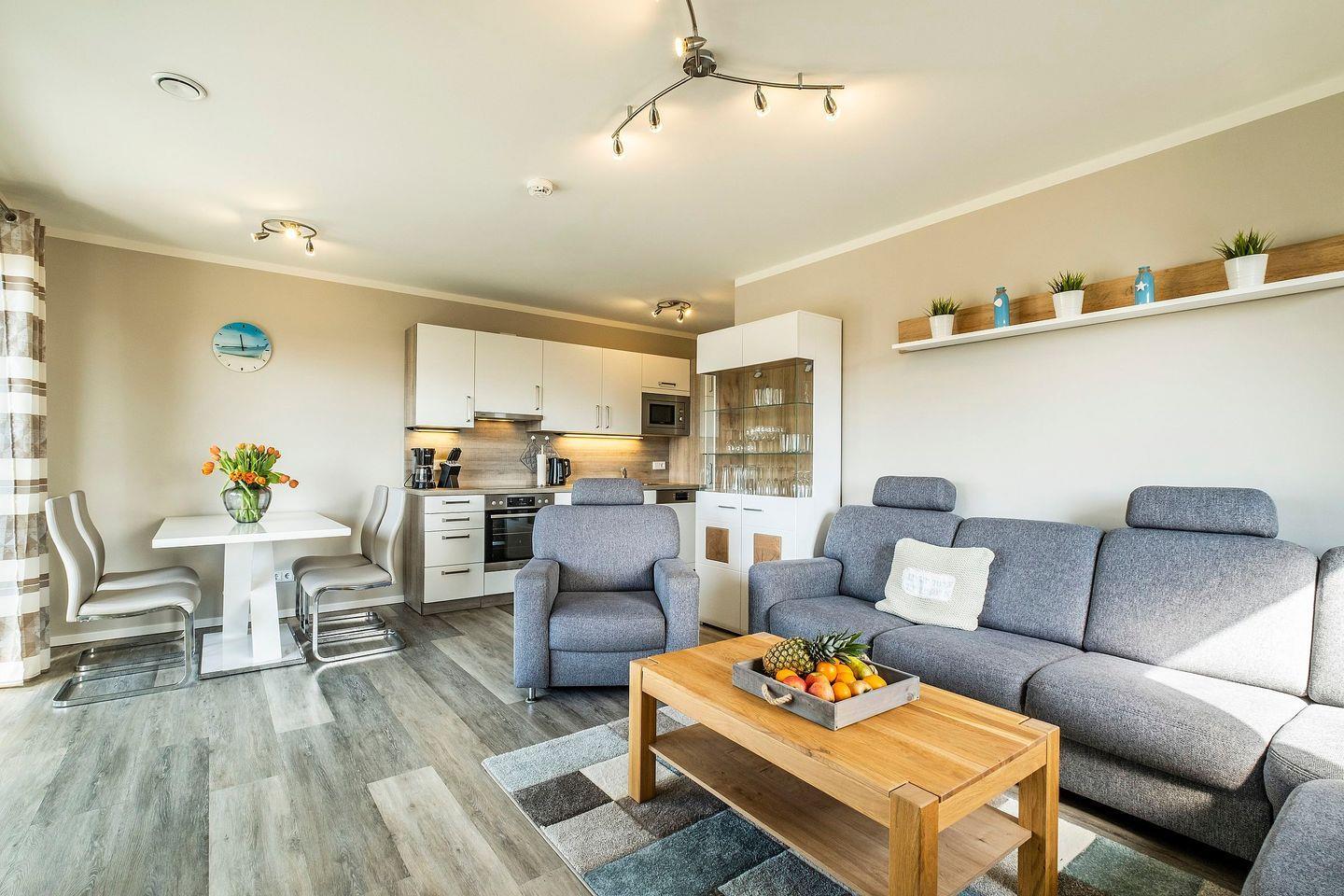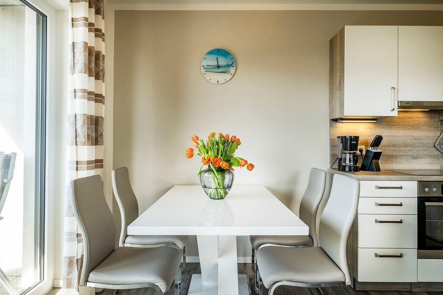 Das Appartement 2.6 (Strandperle) befindet sich im II. Obergeschoss mit Balkon. Die moderne und helle Einrichtung sowie die maritime Dekoration sorgen für eine angenehme Wohlfühlatmosphäre. Der Wohn- und Essbereich bietet ausreichend Platz für bis zu 4 Personen.