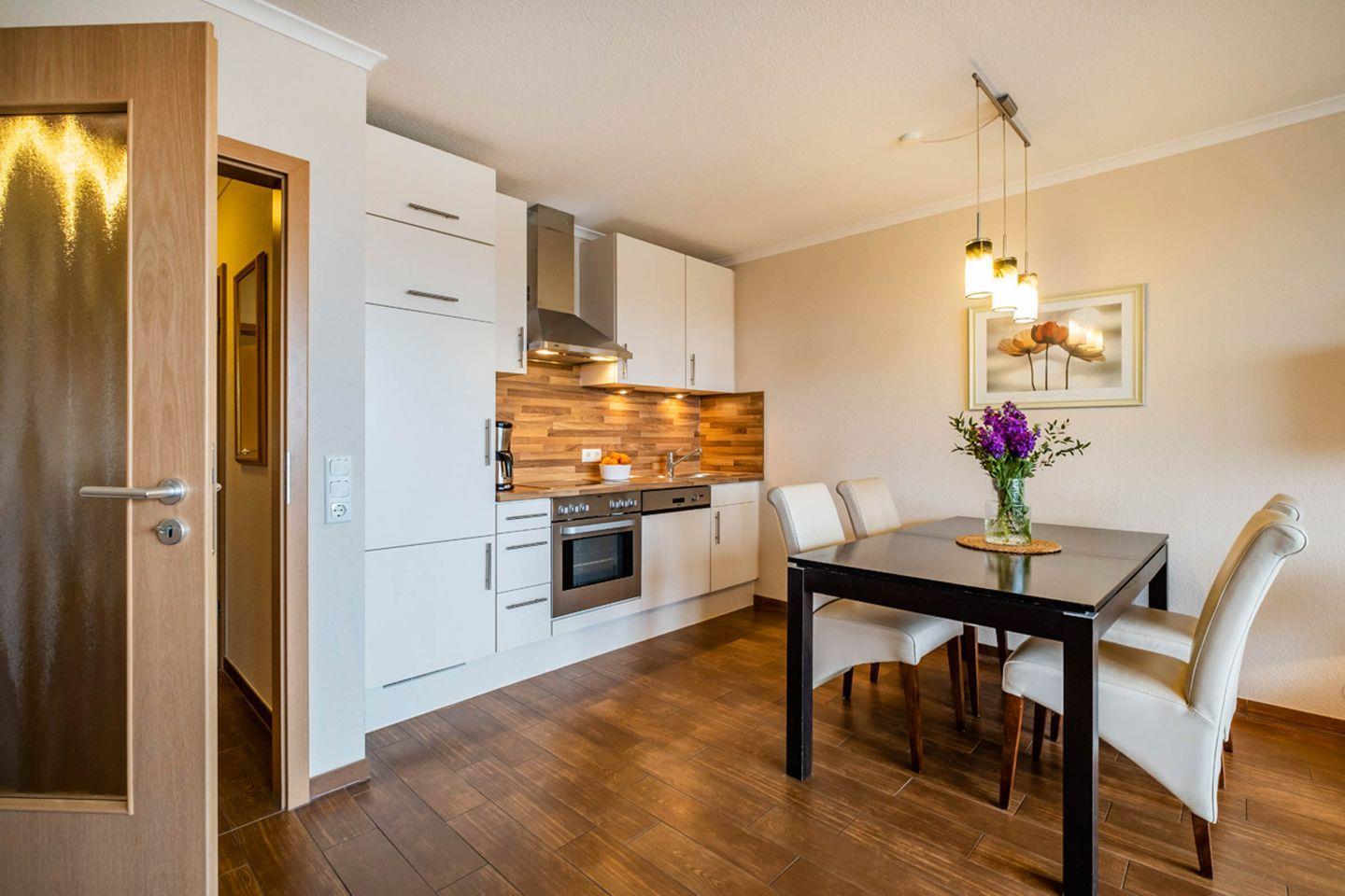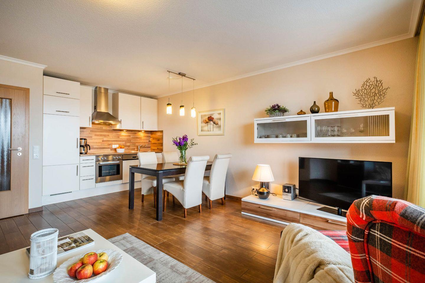 Das Apartment ist hell und freundliche eingerichtet und bietet ein gemütliches Schlafzimmer mit komfortablen Schlafmöglichkeiten für bis zu zwei Personen. Der offene Wohnbereich ist stilvoll gestaltet und enthält eine moderne Küche, die mit allem ausgestattet ist, was zur Zubereitung Ihrer Lieblingsgerichte nötig ist: Herd, Backofen, Mikrowelle, Geschirrspüler, Kühlschrank, und diverse Küchengeräte wie Toaster und Kaffeemaschine stehen Ihnen zur Verfügung. Der große Essbereich lädt zu gemeinsamen Mahlzeiten ein und schafft eine einladende Atmosphäre.
