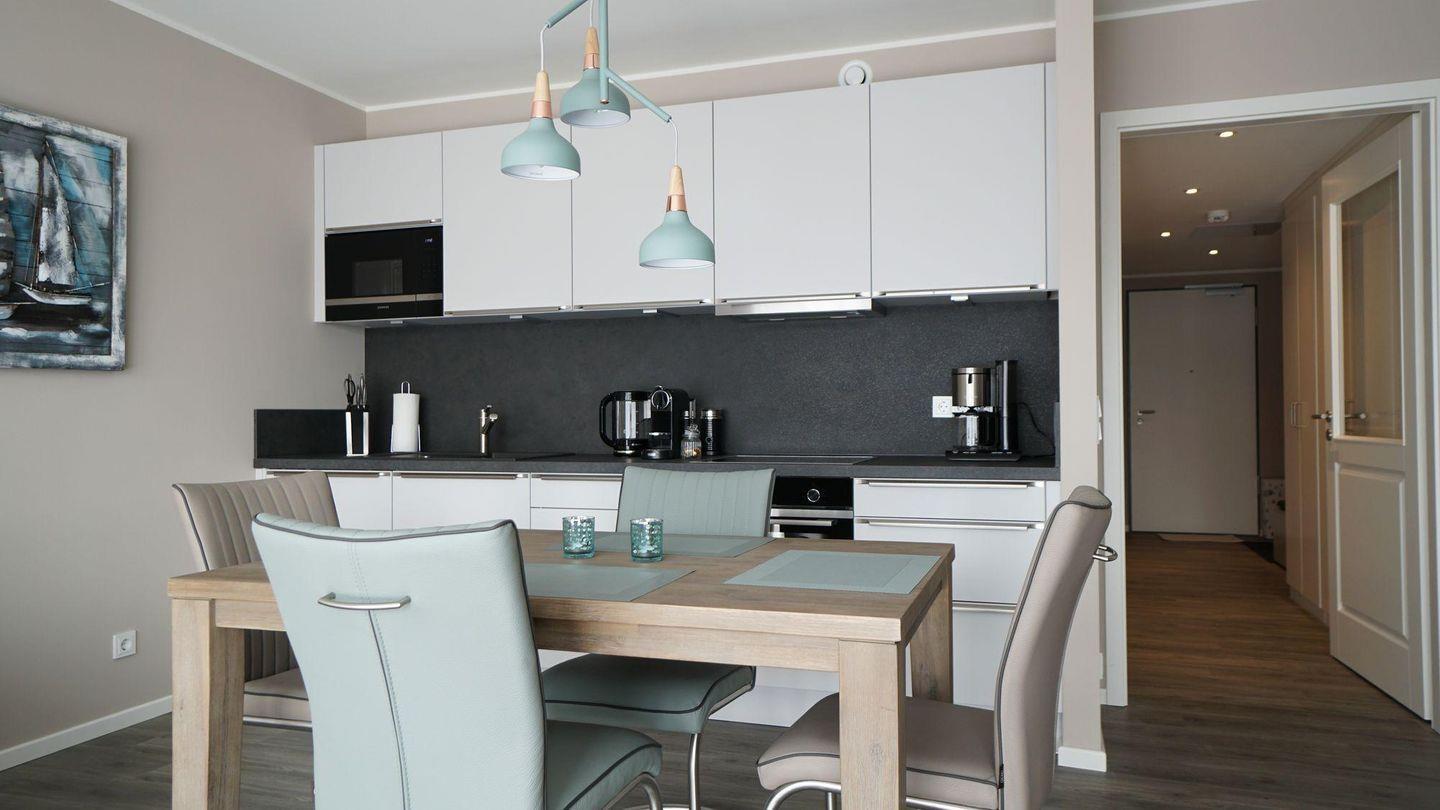 In den Wohnbereich integriert sind eine modern und hochwertig ausgestattete Küchenzeile sowie ein gemütlicher Essbereich zum bequemen Sitzen.