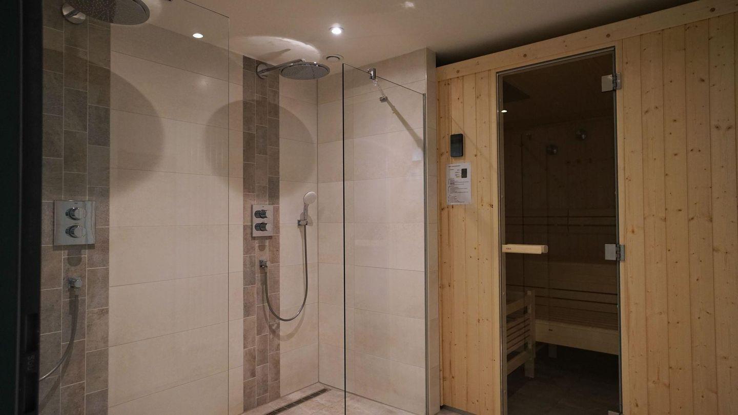 Das geflieste Bad verfügt über eine großzügige bodengleiche verglaste Dusche, eine Handtuchheizung, ein WC, ein Waschbecken mit Unterschrank, einen beleuchteten Wandspiegel und zusätzlich einen ausziehbarer Kosmetikspiegel sowie über einen Fön und einen Sitzhocker.