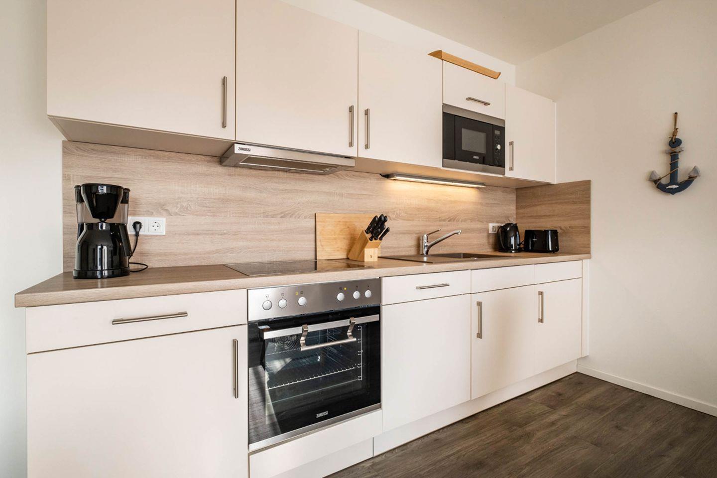 Küche: Backofen, Induktionskochfeld, Mikrowelle, Geschirrspüler, Kühl- Gefrierkombination, Kaffeemaschine, Wasserkocher, Toaster