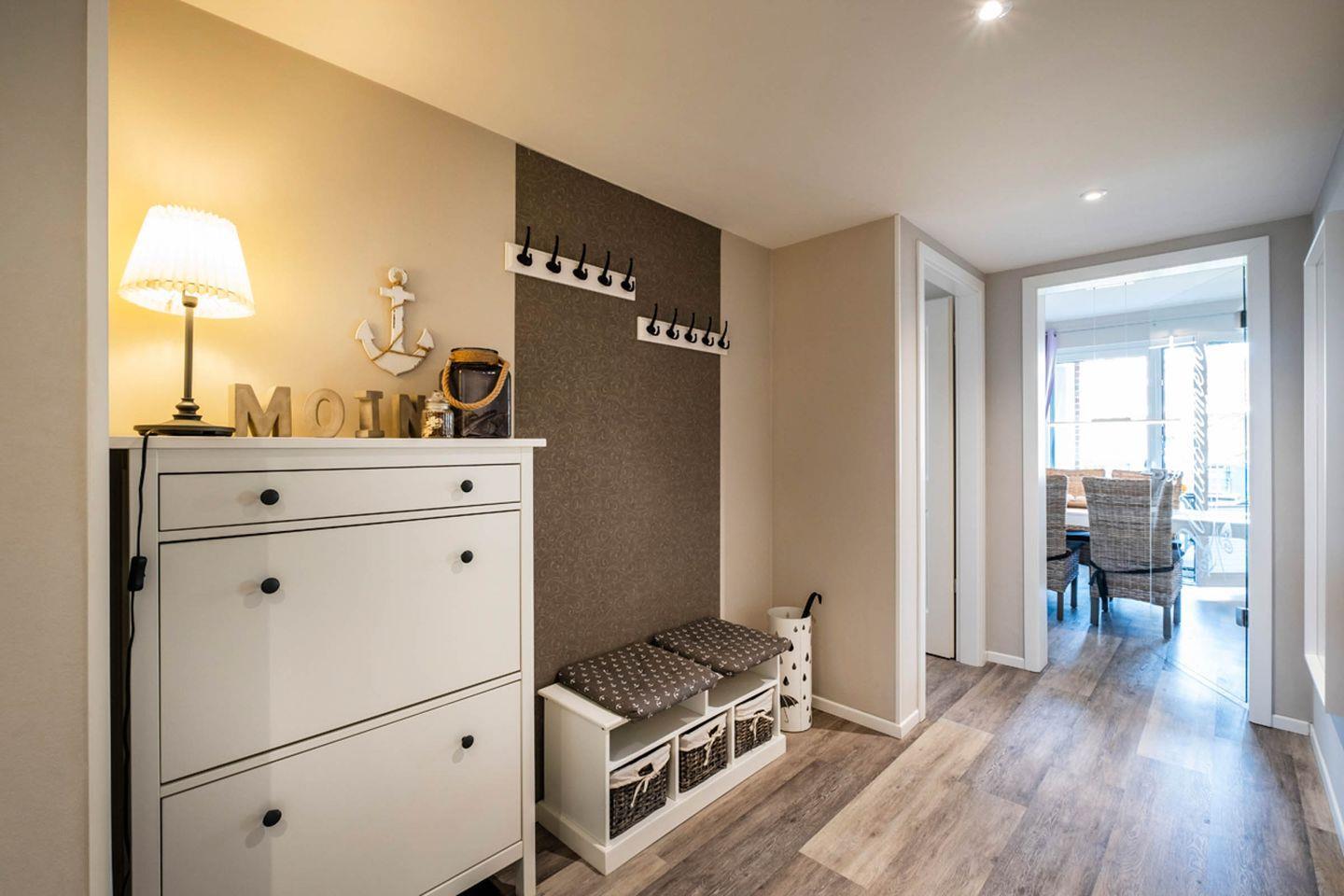 Im Flur befinden sich Garderobe, Schuhschrank, Sitzbank sowie ein großzügiger Spiegel.