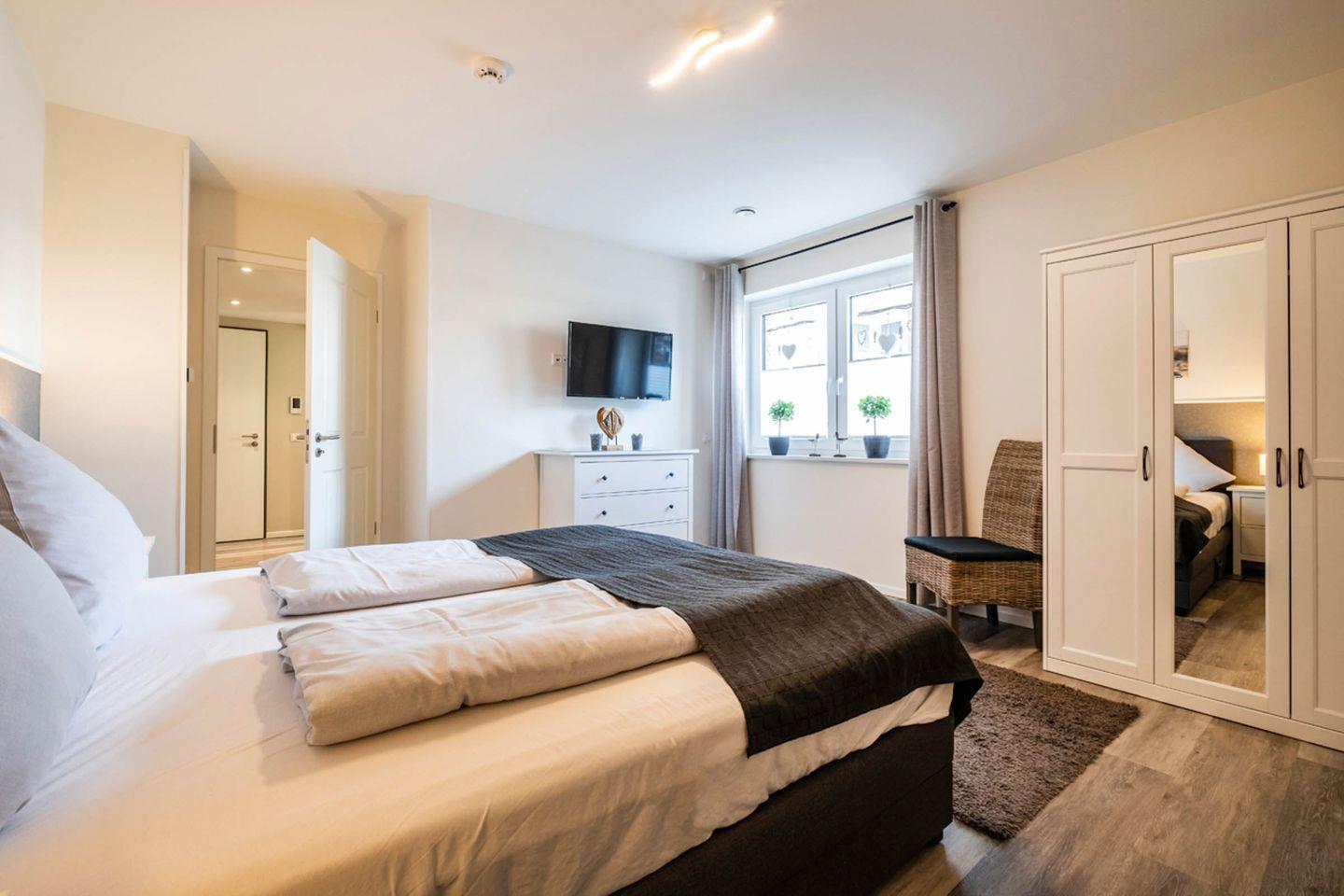 Die Wohnung hat 2 großzügige, liebevoll eingerichtete Schlafzimmer mit je einem elektrisch verstellbarem Boxspringbett (180x200), getrennten Matratzen, einem Flatscreen TV mit einer Bildschirmdiagonale von 102cm. Die Nachttischlampen verfügen über praktische USB Ladeanschlüsse.