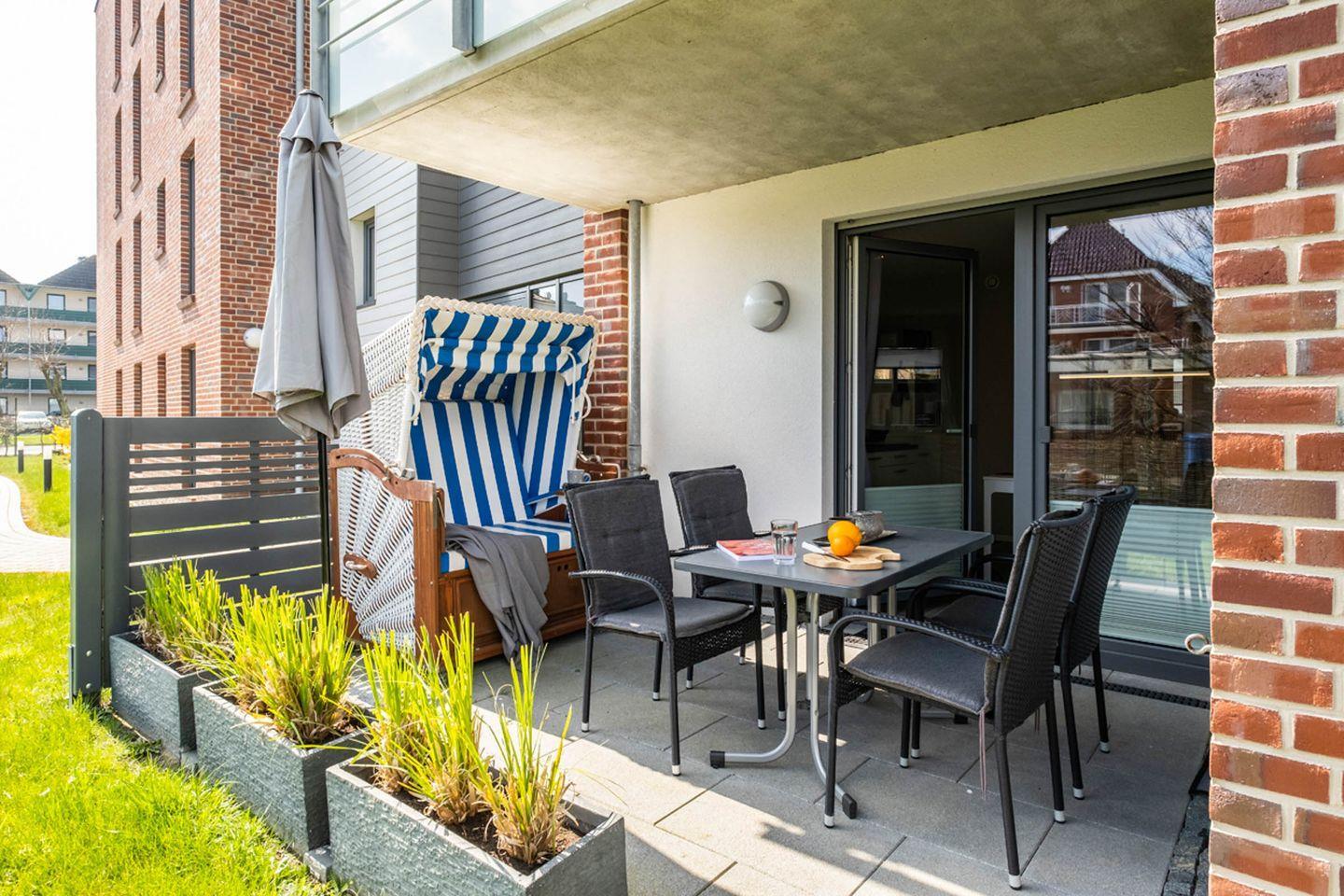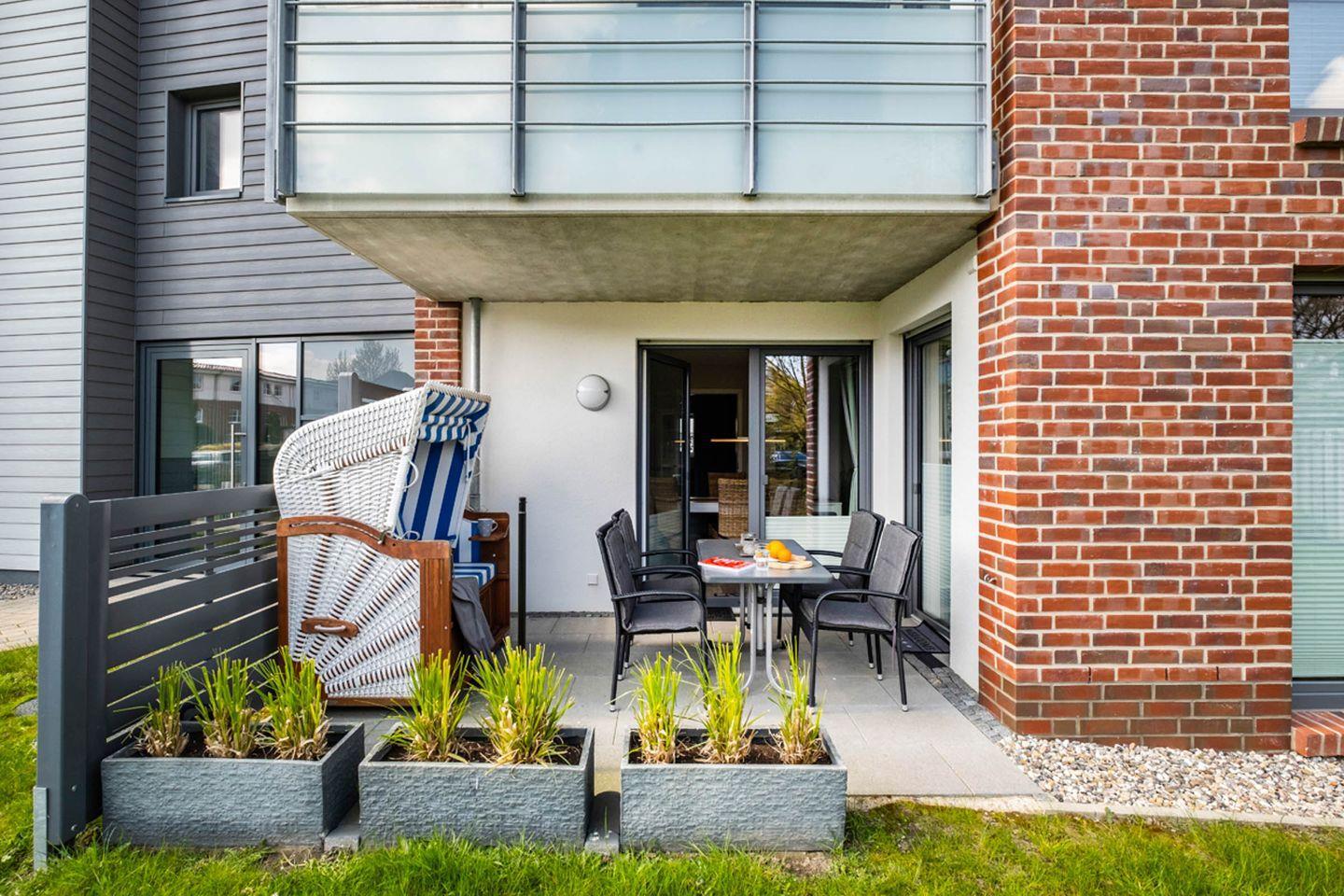 Dem Appartement ist ein PKW- Stellplatz direkt am Haus zugehörig. Ein separater Fahrradraum befindet sich unmittelbar am Gebäude und ist mit dem Hauptschlüssel abschließbar. Auf der Terrasse erwartet Sie ein schöner Strandkorb zum Relaxen.