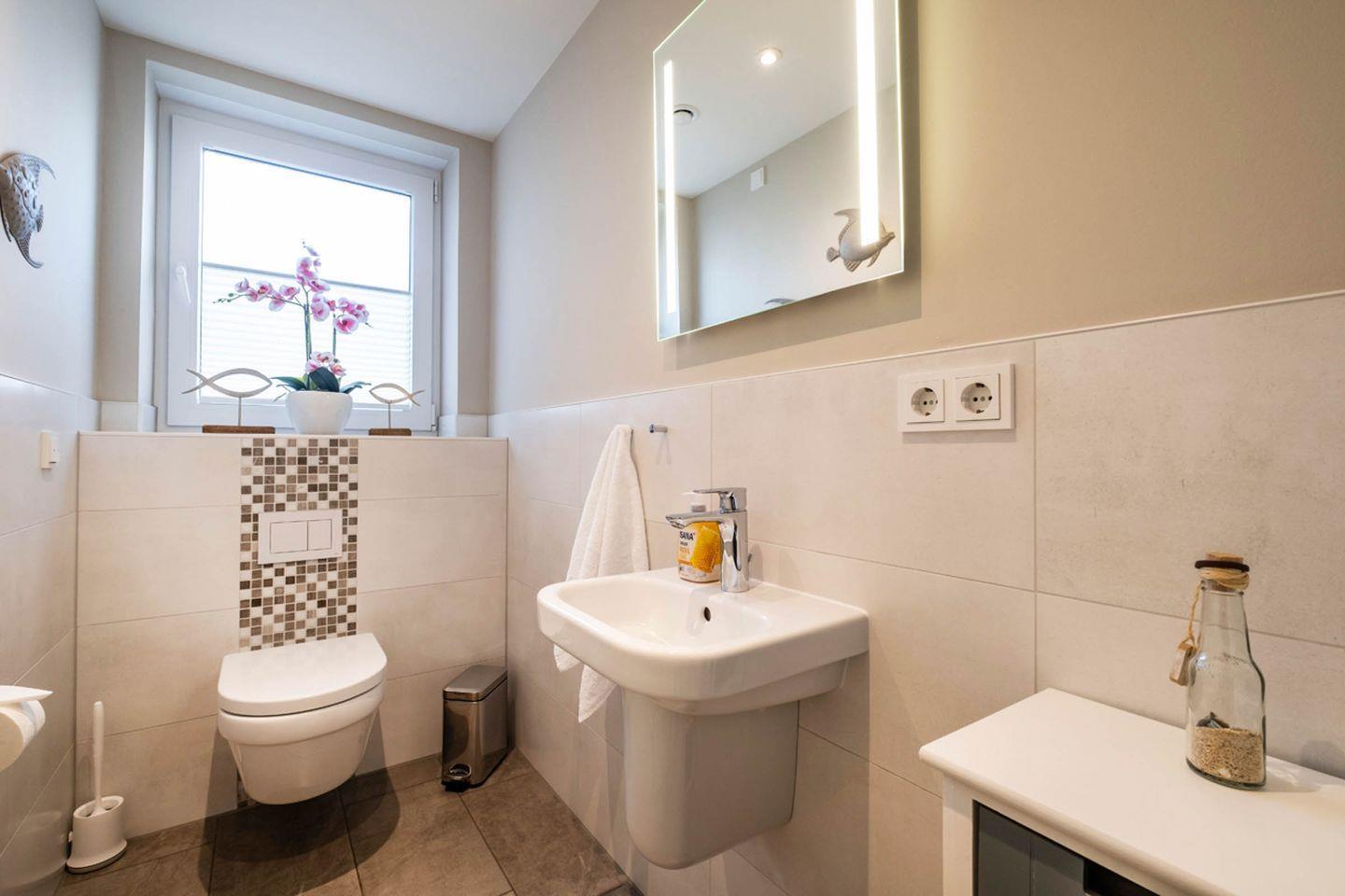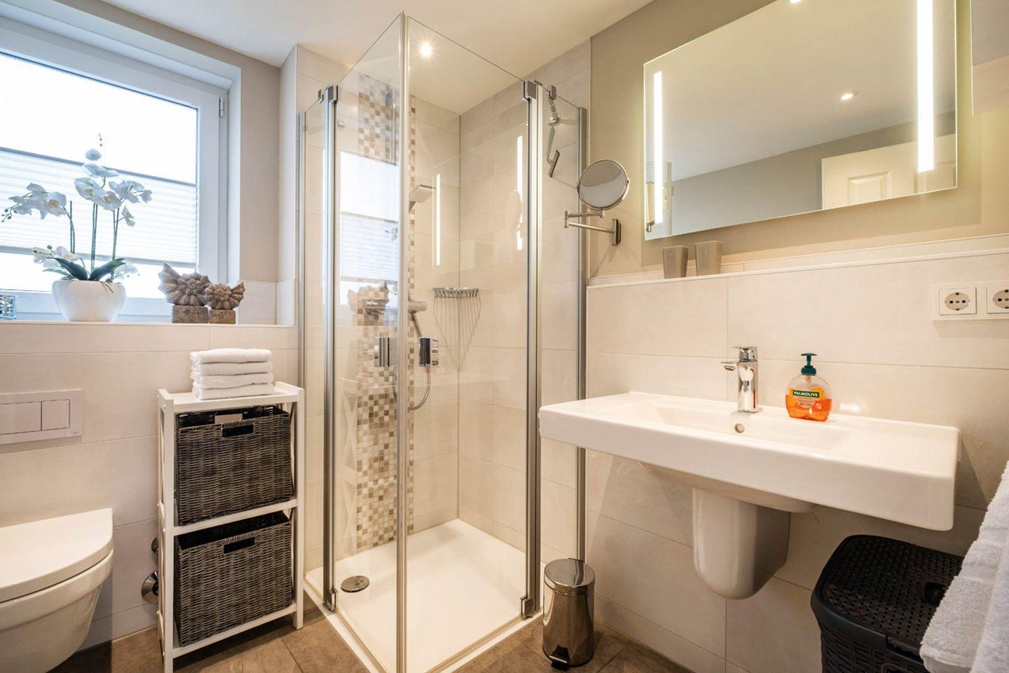 Das Duschbad hat eine ebenerdige Duschwanne und großzügige Ablageflächen. Ebenso ist das Gäste-WC mit Tageslicht ausgestattet. Für die „nachtaktiven“ befindet sich ein Nachtlicht mit Bewegungsmelder im Flur.