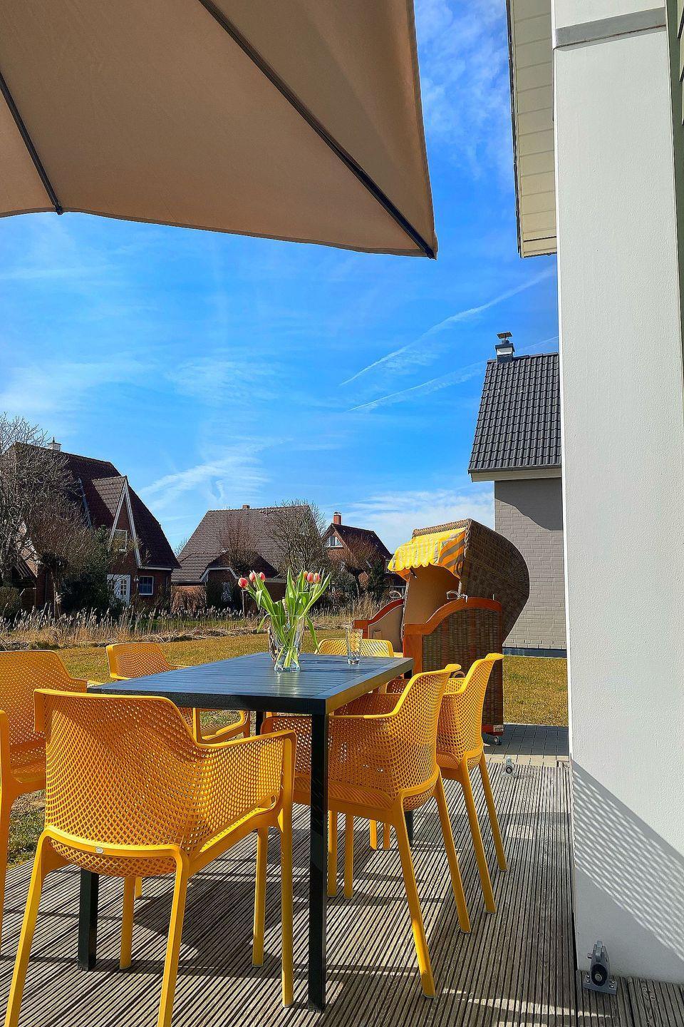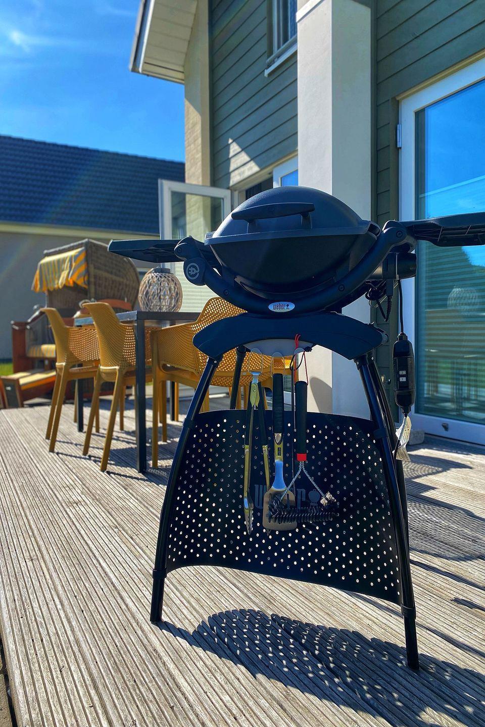 Bei schönem Wetter können Sie auf der mit Möbeln und Sonnenschirm ausgestatteten Terrasse verweilen, in den Liegestühlen entspannen oder die Sonnenstrahl im superschönen Strandkorb genießen. Auch ein Webergrill steht hier für Sie bereit!