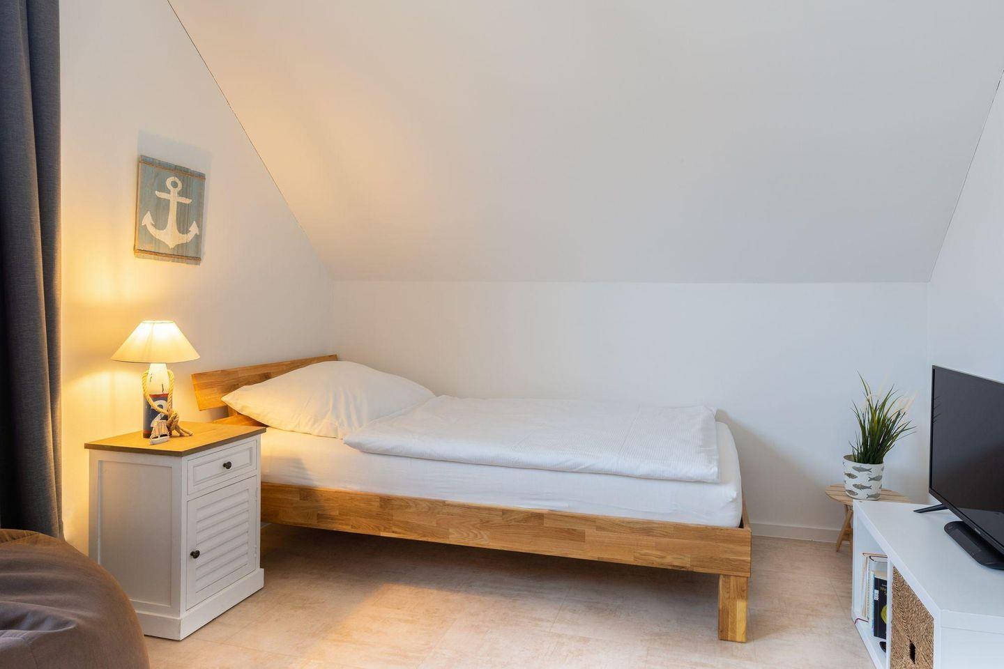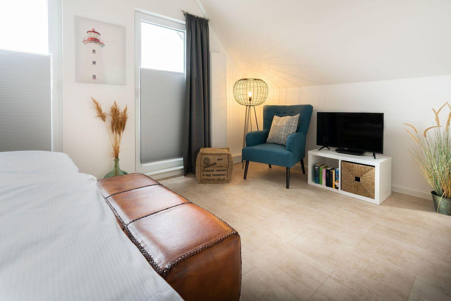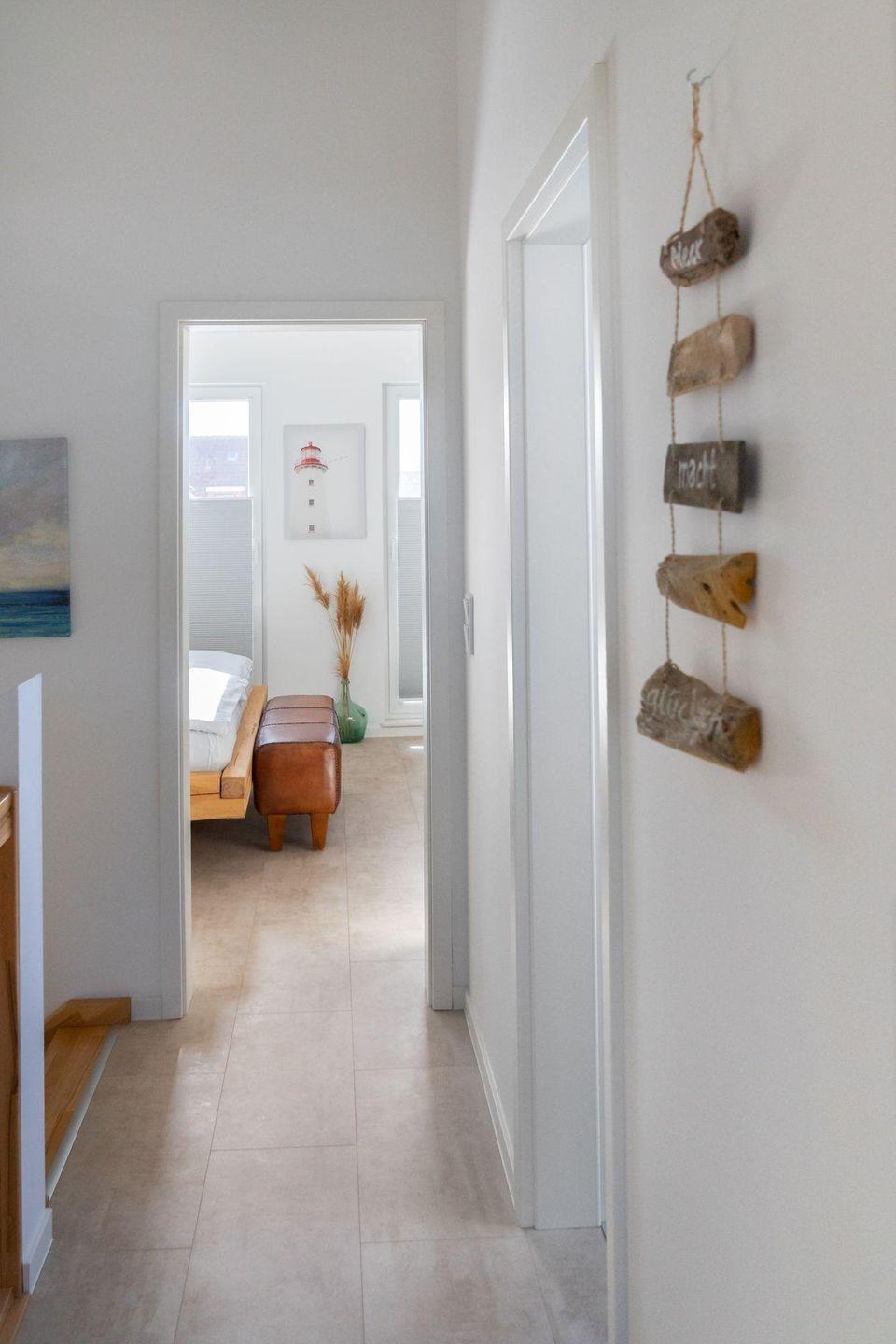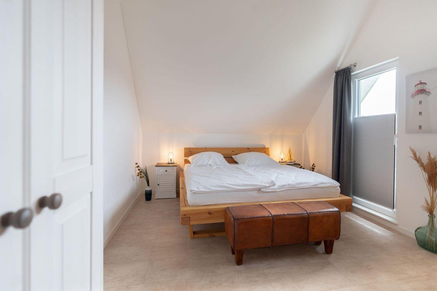 Damit Sie auch bei „Schietwetter“ Ihren Urlaub in vollen Zügen genießen können, wird diese Etage abgerundet durch ein großzügiges Gäste-/Duschbad, das mit einer Infrarot-Sauna ausgestattet ist. Vom Wohnzimmer aus gelangt man über eine Treppe in das Dachgeschoss. Der sich hier anschließende Flurbereich wird zu Beginn durch ein modernes und geräumiges Bad mit Badewanne und darauffolgend von zwei gemütlichen Schlafräumen gesäumt. Ein Schlafraum ist ausgestattet mit einem Bett mit 180x200 cm und der zweite Schlafraum mit 2 Betten jeweils mit 90x200 cm.
