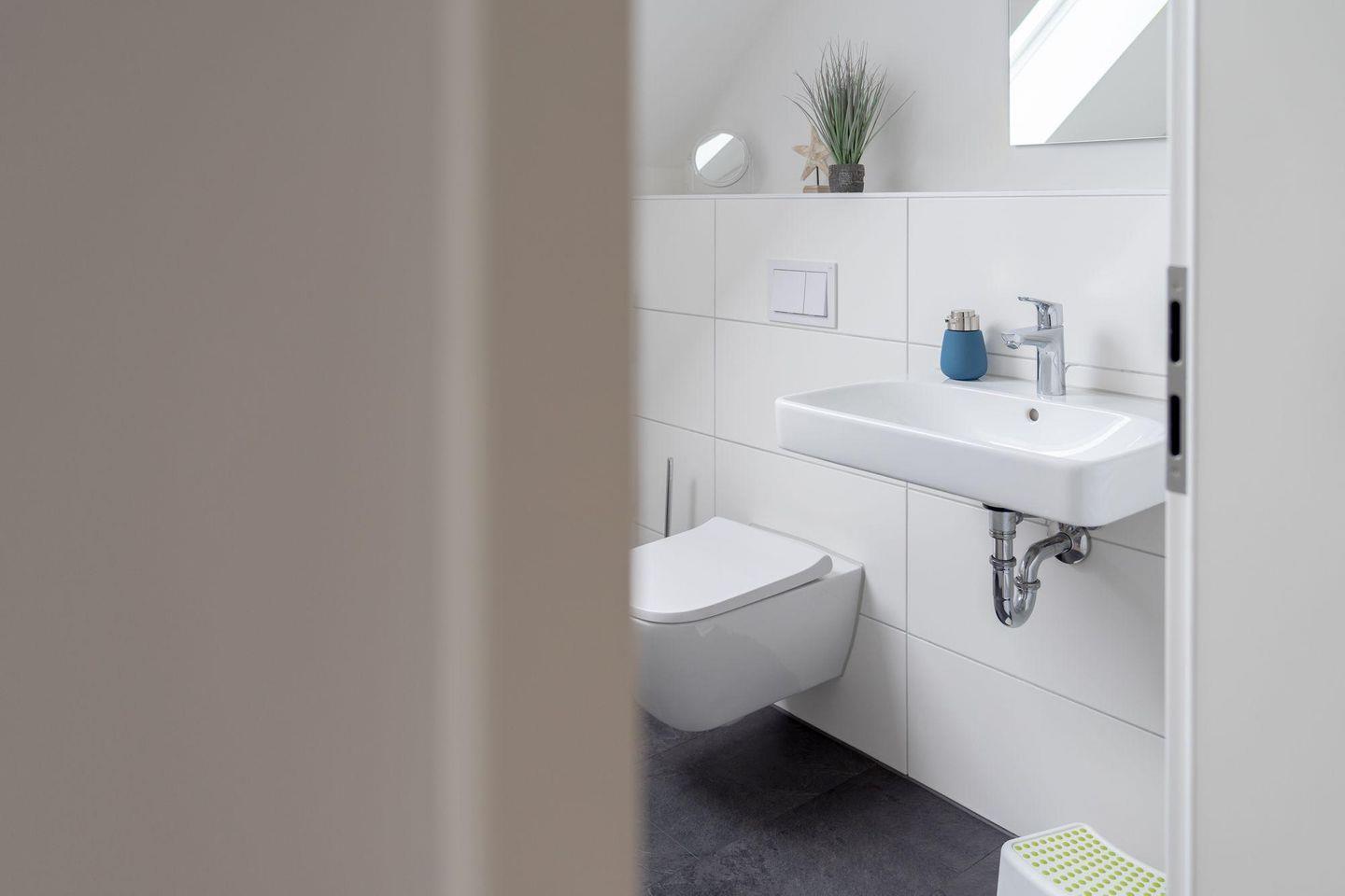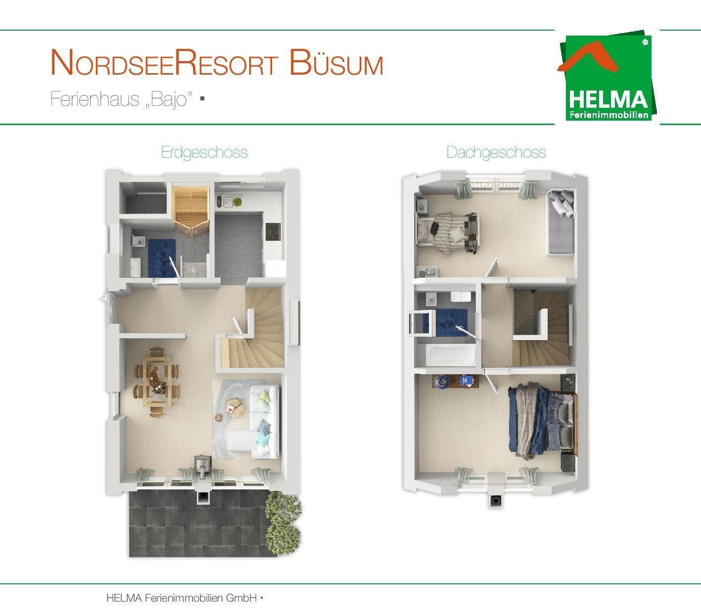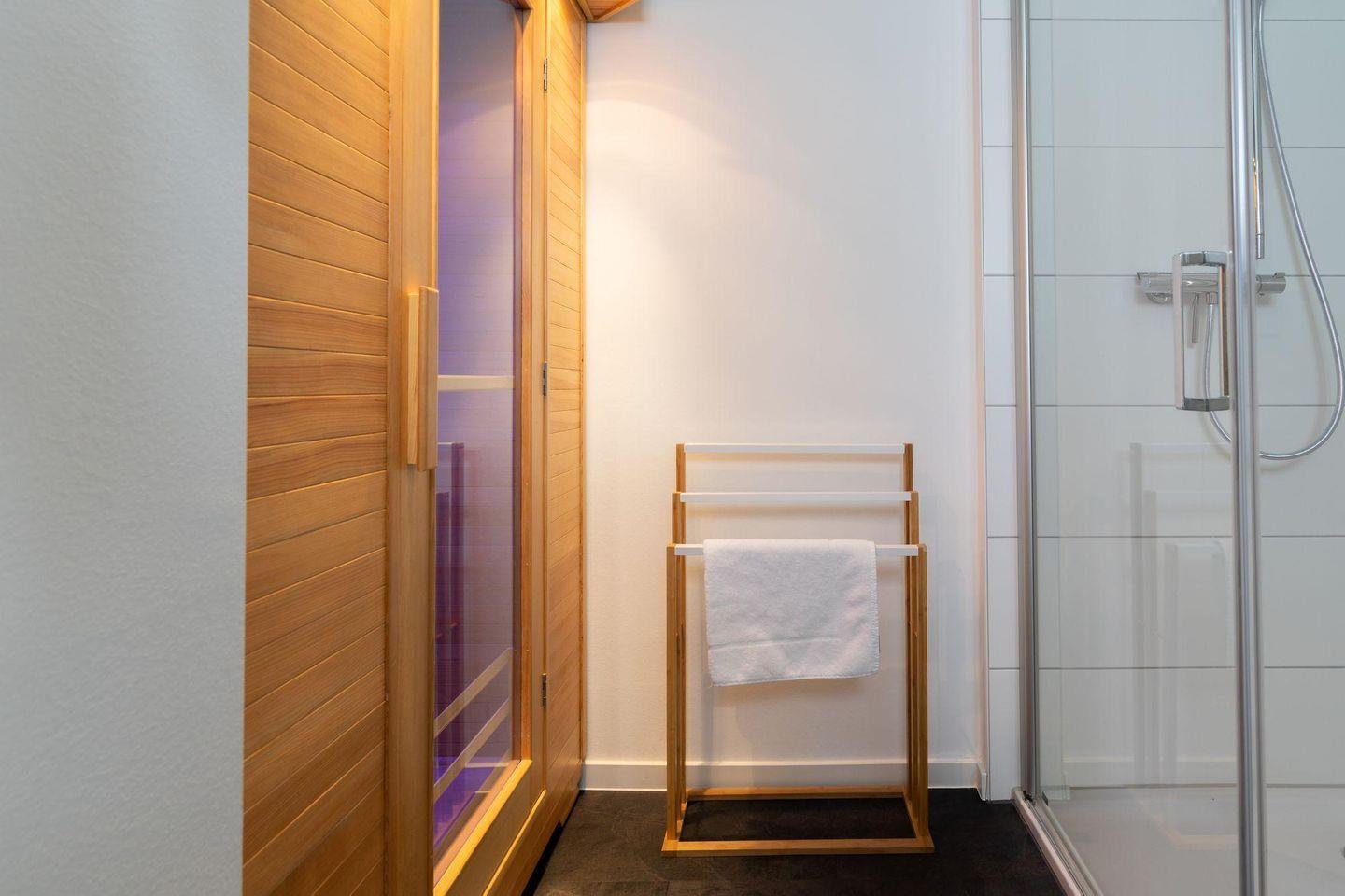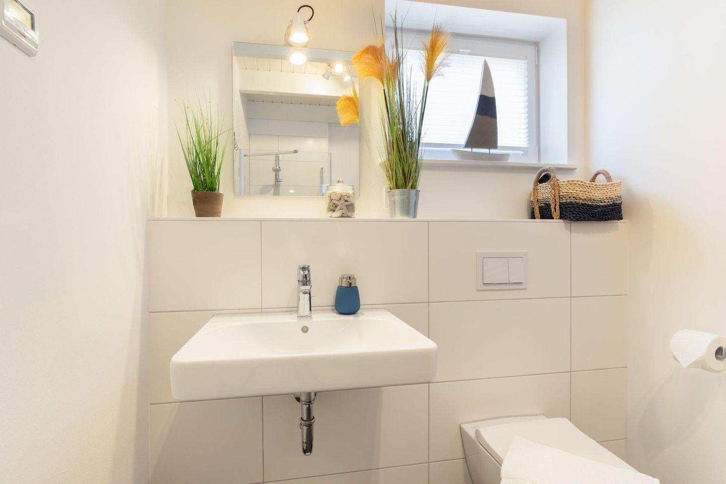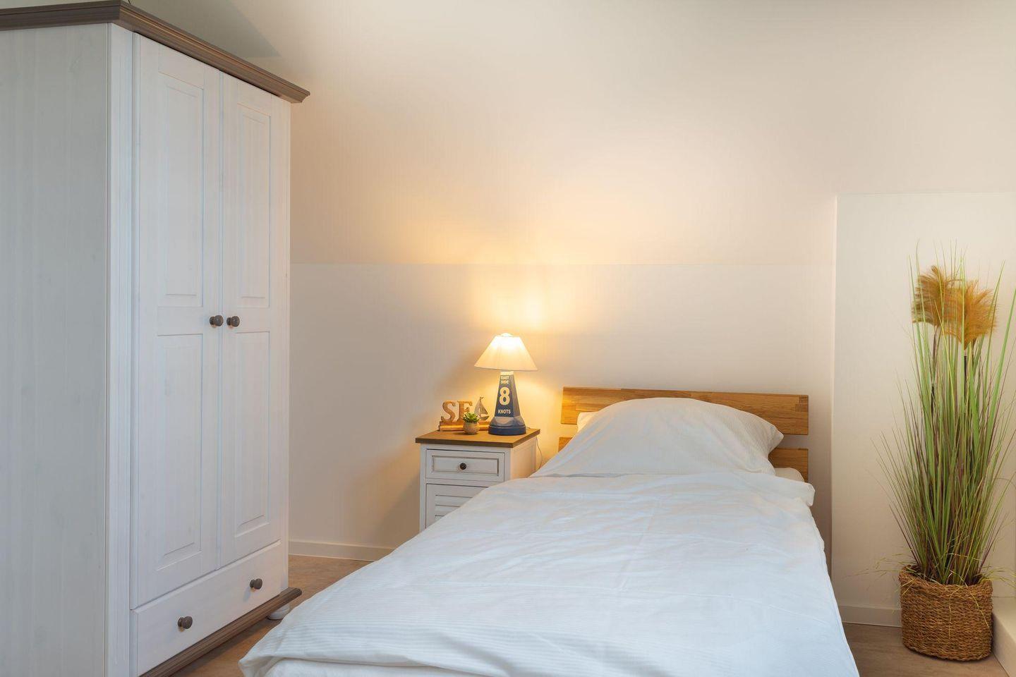 Damit Sie auch bei „Schietwetter“ Ihren Urlaub in vollen Zügen genießen können, wird diese Etage abgerundet durch ein großzügiges Gäste-/Duschbad, das mit einer Infrarot-Sauna ausgestattet ist. Vom Wohnzimmer aus gelangt man über eine Treppe in das Dachgeschoss. Der sich hier anschließende Flurbereich wird zu Beginn durch ein modernes und geräumiges Bad mit Badewanne und darauffolgend von zwei gemütlichen Schlafräumen gesäumt. Ein Schlafraum ist ausgestattet mit einem Bett mit 180x200 cm und der zweite Schlafraum mit 2 Betten jeweils mit 90x200 cm.