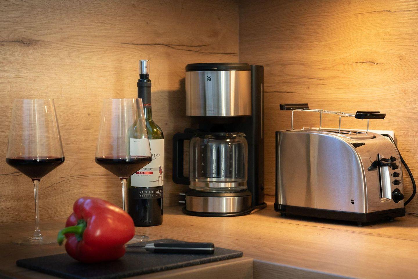 Küche: Cerankochfeld, Kühlschrank mit Gefrierfach, Waschmaschine, Toaster, Wasserkocher, Filterkaffeemaschine, Thermomix