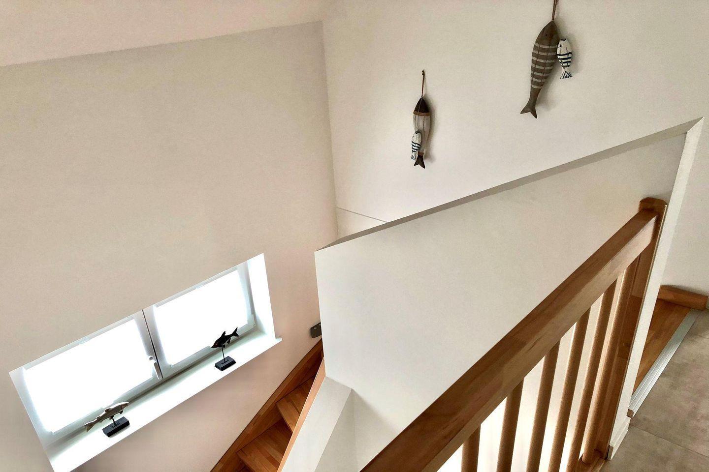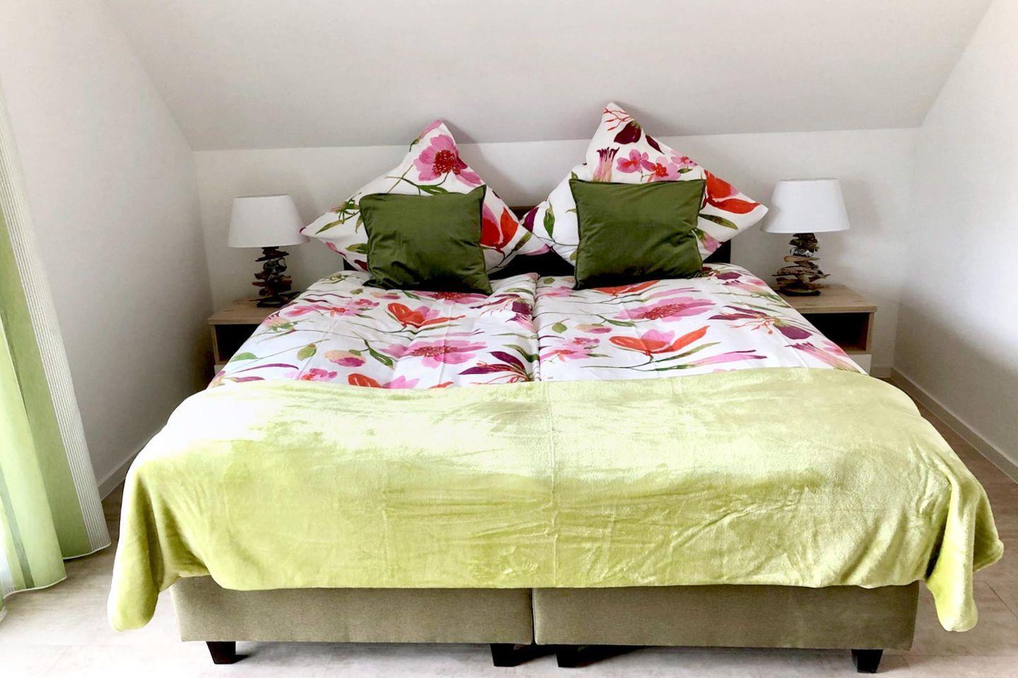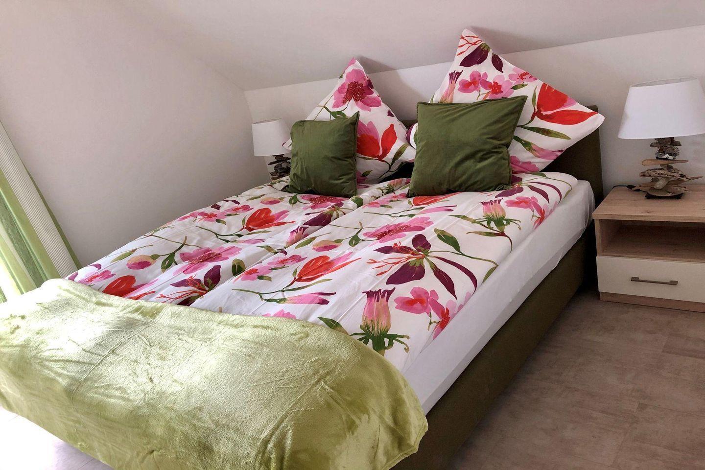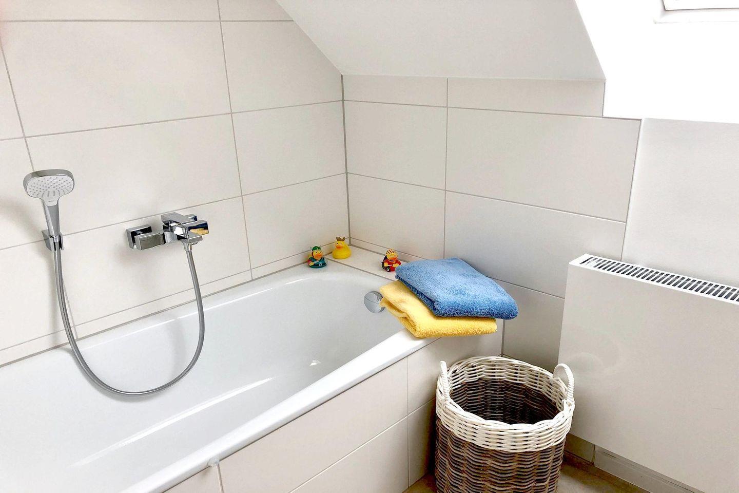 Über die Treppe gelangen Sie ins Obergeschoß mit 2 Schlafzimmern und einem Bad mit Badewanne. Das eine Schlafzimmer ist mit einem Boxspringbett (180x200), TV und einem großen, gemütlichen Sessel ausgestattet. In dem anderen Schlafzimmer befindet sich ein Boxspringbett (160x200) sowie eine Récamiere mit Schlaffunktion.