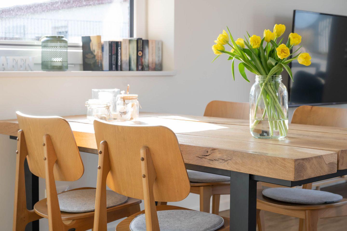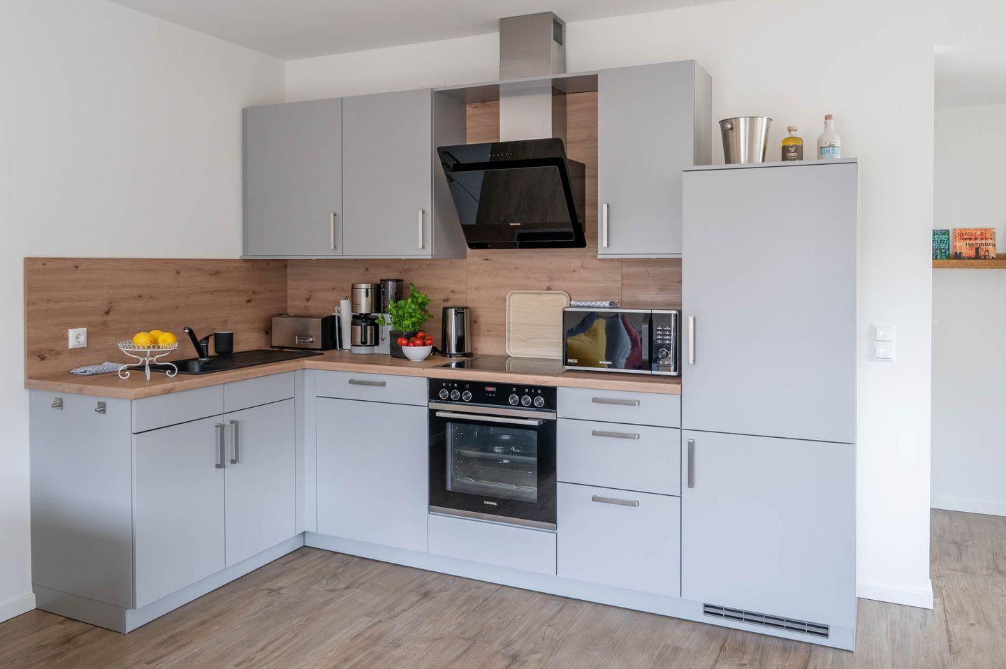 Die zum Wohnraum hin offene Küche lässt wenig Wünsche offen. Von der Zubereitung des Frühstücks samt Kaffee und Tee bis hin zum opulenten Mittag- oder Abendessen, jeder Genießer und Hobbykoch kommt hier ganz und gar auf seine Kosten. Der Esstisch ermöglicht ein gemütliches Zusammensitzen, auch nach dem Essen.