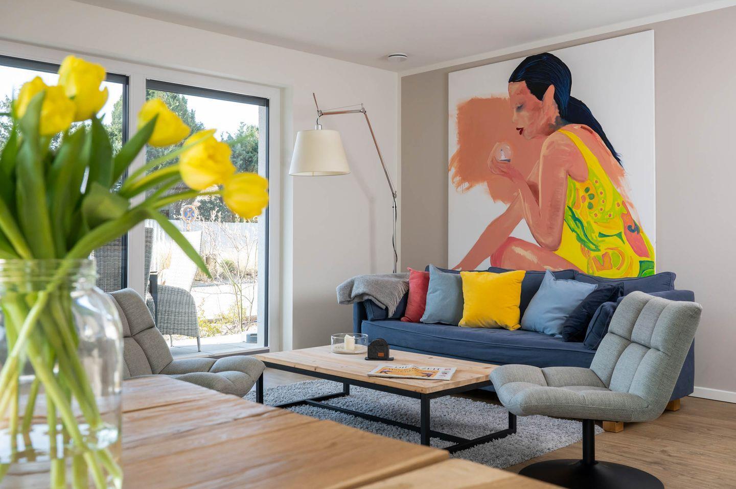 Der Neubau bietet ein gemütliches, naturverbundenes Ambiente durch die Kombination aus norddeutschem Charme und hochwertigem, nachhaltigem Design. Der Blick ins Grüne aus den beiden Schlafzimmern und die Möglichkeit, die Sonne auf der eigenen Terrasse zu genießen, steigert den Wohlfühlfaktor. Doch selbst wenn das gute Wetter mal ausbleibt, ist das kuschelige Sofa der perfekte Rückzugsort.