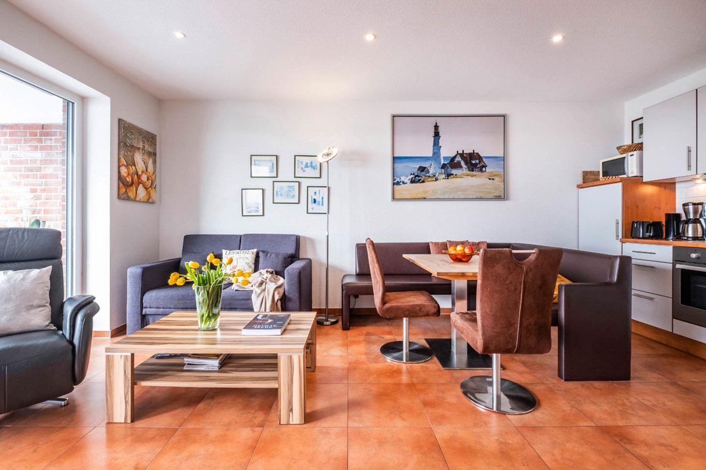 Das Haus Ankerplatz Apartment 3.5 in Büsum bietet auf 53 m² ein komfortables Wohnerlebnis für bis zu zwei Personen. Die Unterkunft überzeugt durch einen Balkon mit Meerblick, eine offene Küche, modernes Wohnzimmer, WLAN, Spülmaschine und privaten Parkplatz. Der Strand, Einkaufsmöglichkeiten und Restaurants sind nur 250 Meter entfernt. Ein Aufzug sorgt für bequemen Zugang zum Apartment im 3. Stock.