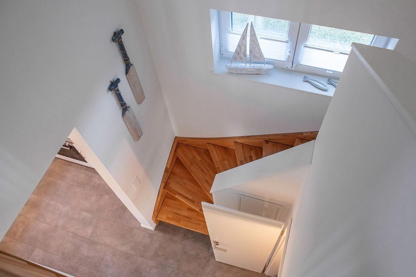 Über eine Massivholztreppe erreicht man das Dachgeschoss. Unter der Treppe kann ein Abstellraum genutzt werden; dort befindet sich auch ein kleiner Safe. Das Dachgeschoss verfügt über zwei mit Boxspringbetten ausgestattete Schlafzimmer und ein zweites Bad mit Badewanne und Duschmöglichkeit. Ein Schlafzimmer verfügt über zwei Einzelbetten, das andere über ein Doppelbett. Eine Ottomane bietet hier zudem einen gemütlichen Ruhe- und Rückzugsbereich. Beide Schlafzimmer sind mit Smart-TV-Geräten ausgestattet.