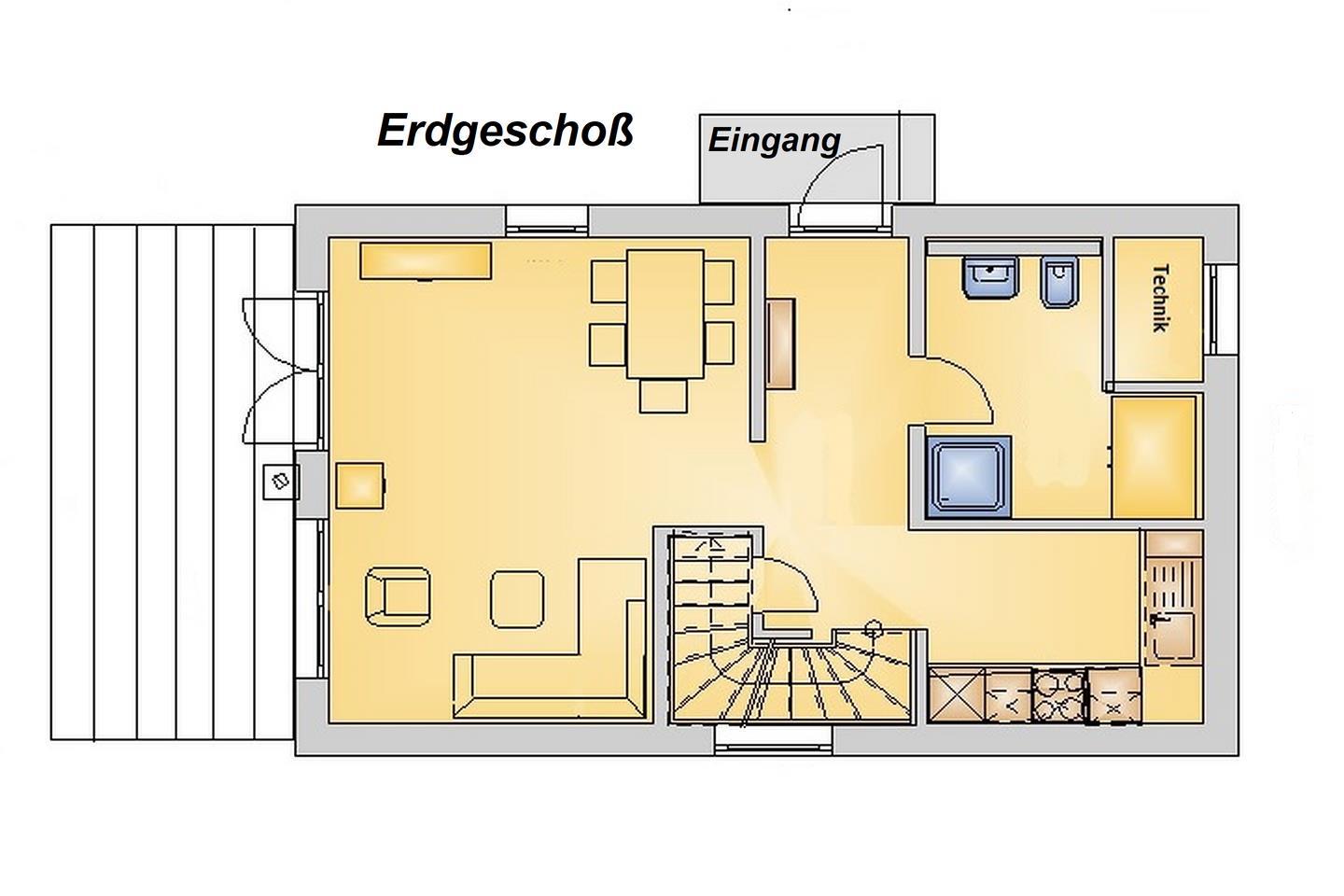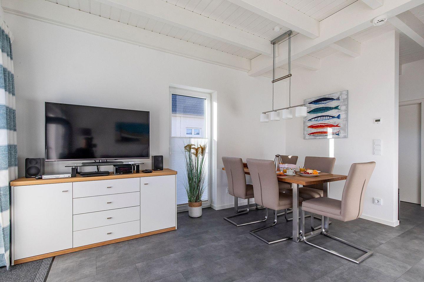 Das lichtdurchflutete Haus mit hohen Räumen und weiß lasierter Holzbalkendecke im Erdgeschoss bietet mit ca. 79 m² Wohnfläche reichlich Platz für vier Gäste. Das Wohnzimmer verfügt über eine bequeme Sofalandschaft mit einem Drehsessel, der Essbereich über einen großen Esstisch mit Freischwingern sowie über ein Sideboard mit Smart-TV, Bluray-Player und Stereo-Anlage. Zur Unterhaltung stehen Bücher, BluRays, CDs und eine Spielesammlung zur Verfügung. Das Haus verfügt über einen Glasfaseranschluss, der kostenfreies WLAN sowie Magenta-TV bietet. Vom Wohnzimmer aus gelangt man auf die nach Süden ausgerichtete großzügige Terrasse und zum Garten. Gartenmöbel und zwei Sonnenliegen stehen zur Verfügung, ebenso ein Holzkohlegrill und ein Strandkorb.