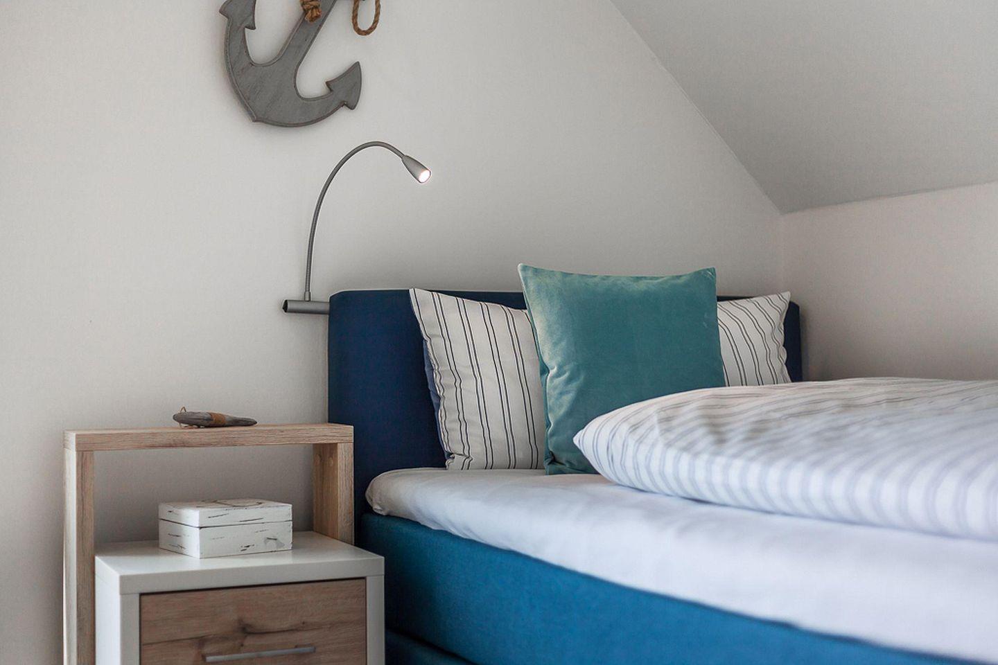 Den krönenden Abschluss für jeden Tag bereiten die Schlafzimmer. Hier können bis zu sechs Personen einschlafen. Alle drei Schlafzimmer verfügen über hochwertige Boxspringbetten und verführen zum eintauchen und zu gemütlichen Kuschelstunden. Es sind zwei Räume mit Doppelbett in der Größe 180x200 cm vorhanden und ein Raum mit zwei Einzelbetten in der Größe 90x200 cm. Alle Schlafzimmer verfügen über einen Flachbildfernseher. In der oberen Etage hat man einen wunderschönen Blick auf den Deich.