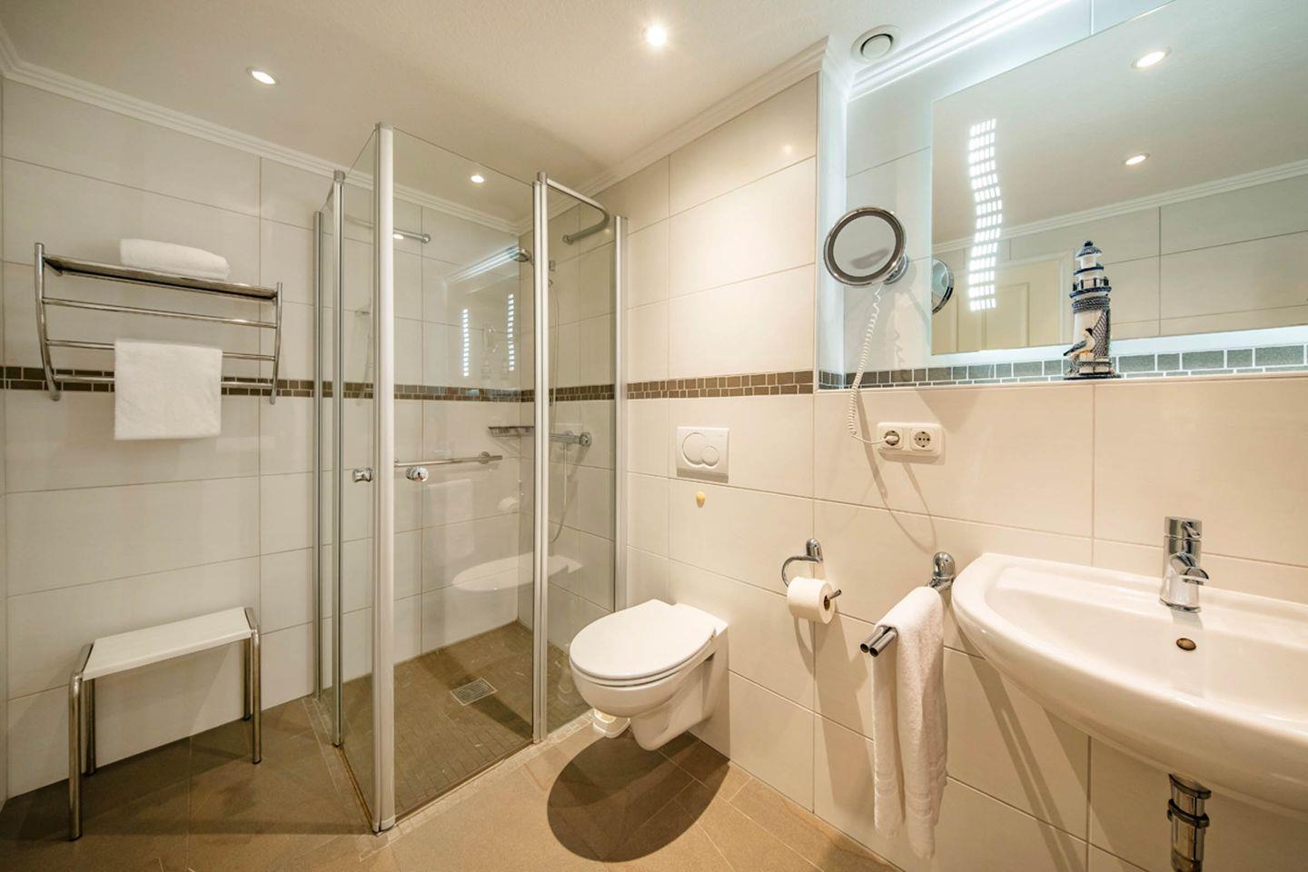 Sanitär: Duschbad mit ebenerdiger Dusche, Haar-Föhn, Kosmetikspiegel