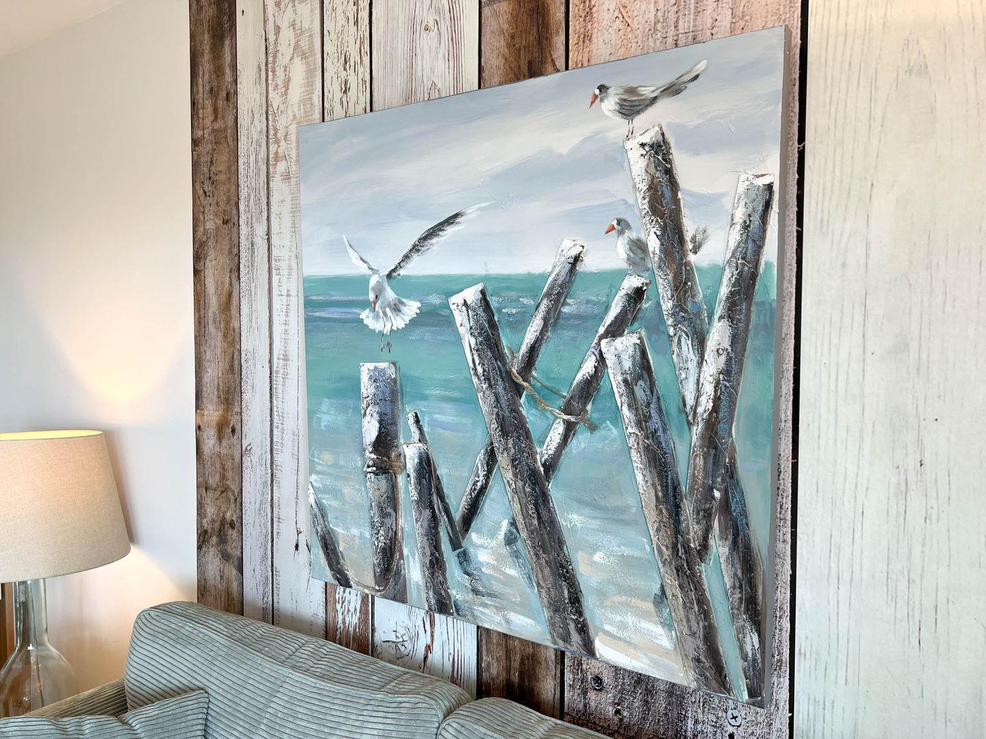 Das Meer lässt sich auch vom lichtdurchfluteten Wohnzimmer aus betrachten, dem Herz des Möövnests. Hier laden der kuschelige XL-Lounge-Sessel, das komfortable Sofa und ein großer TV-Flatscreen ein, sich gemütlich einzunisten und es entspannt gut gehen zu lassen.